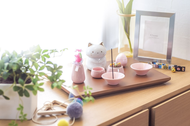 最近では、ペット専用としてデザインされた仏壇や仏具も増えており、リビングや寝室に置いても違和感のない、やさしい佇まいのものが選ばれています。