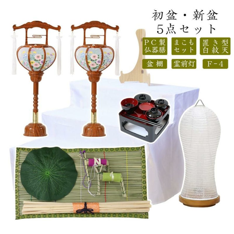 【F-5】(5点セット 白紋天+盆提灯 No.2920+まこもセット+PC仏器膳+盆棚)