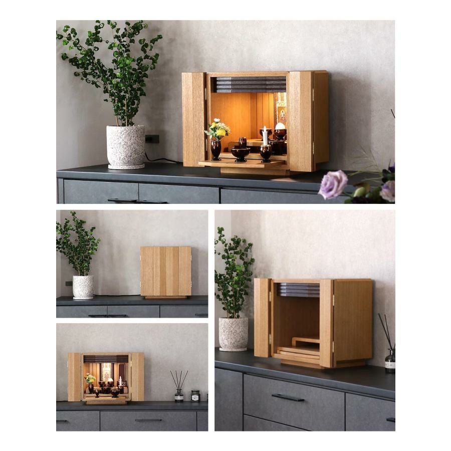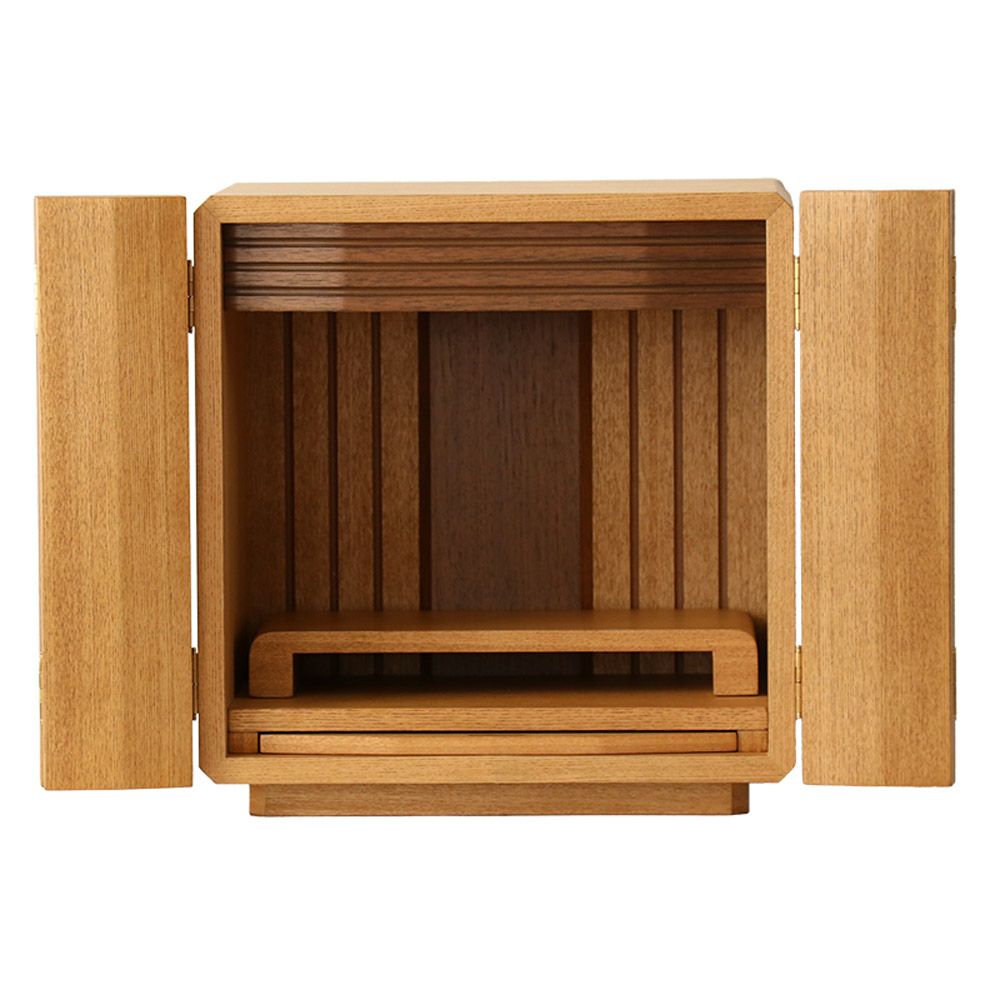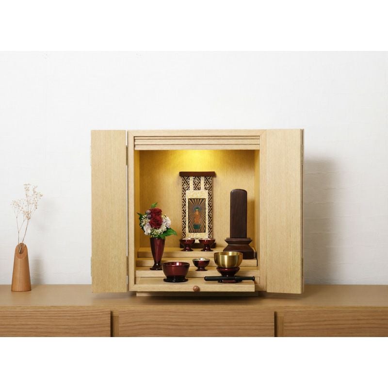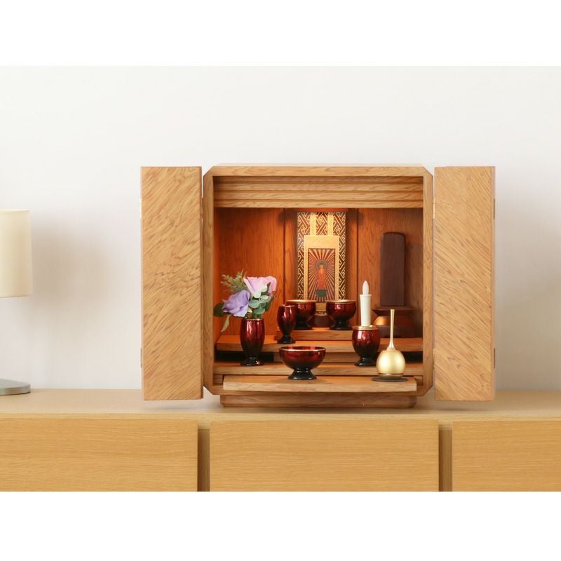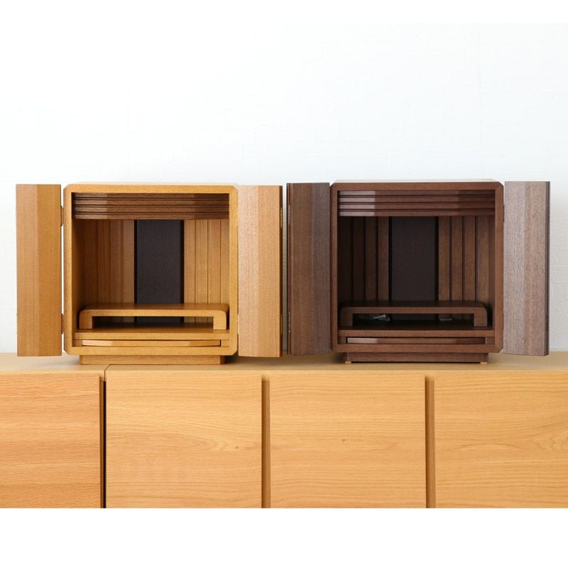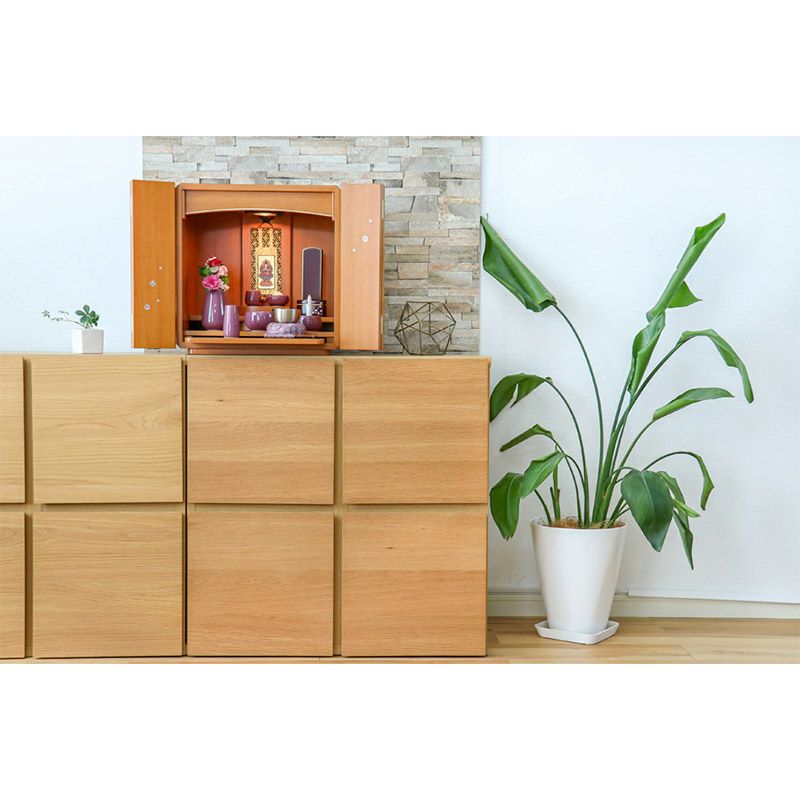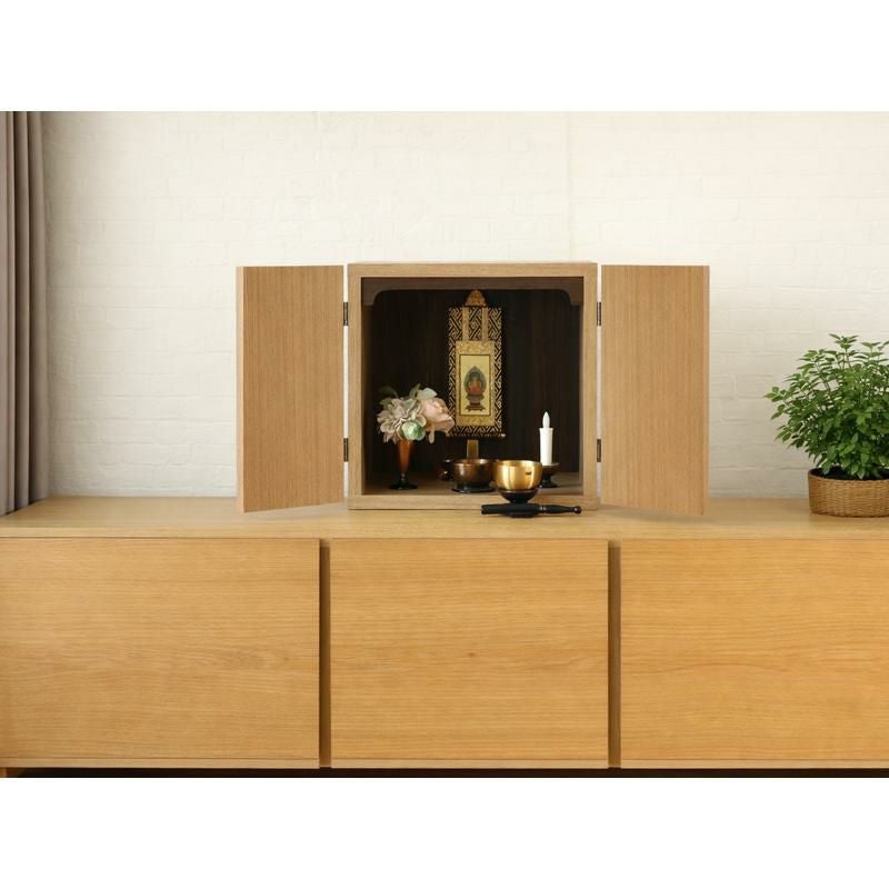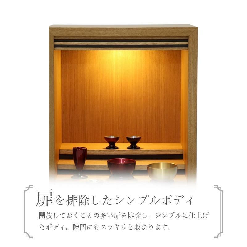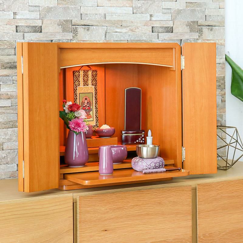 扉のないシンプルなデザインのお仏壇です。大きなお仏壇を置く場所がない方に、リビングの一角でおまいりしたい方に、お仏壇らしくないデザインをお探しの方におすすめです。