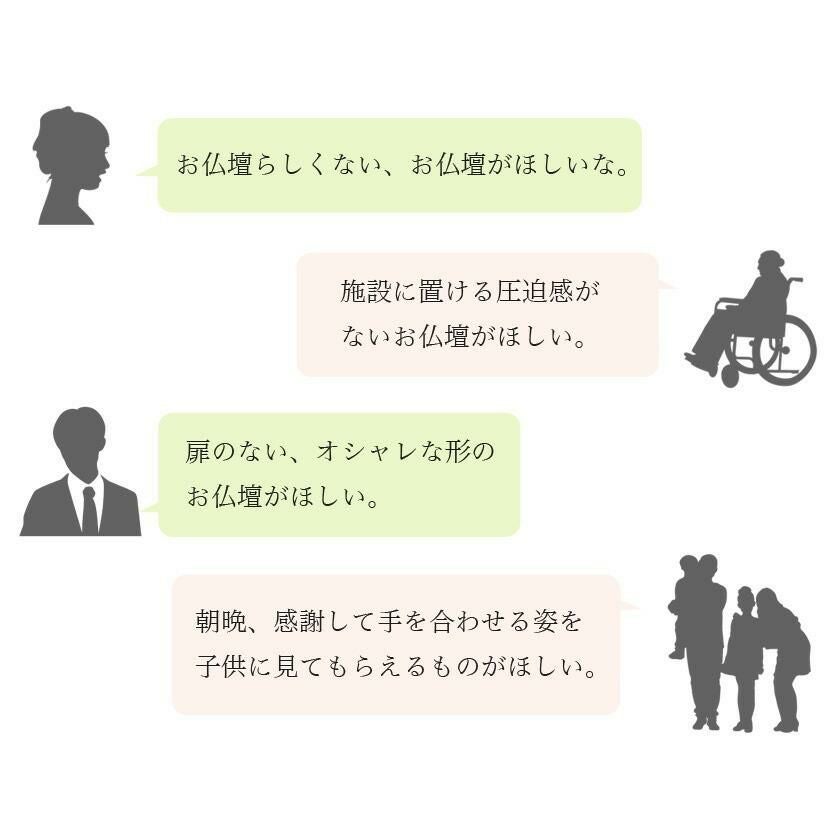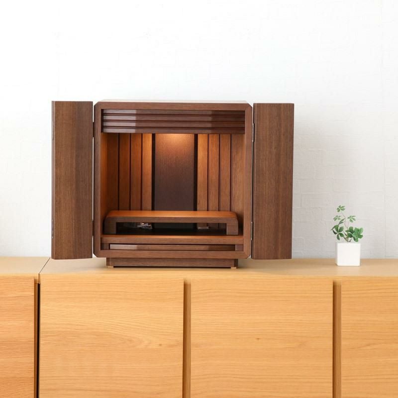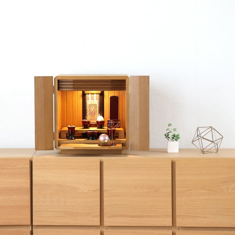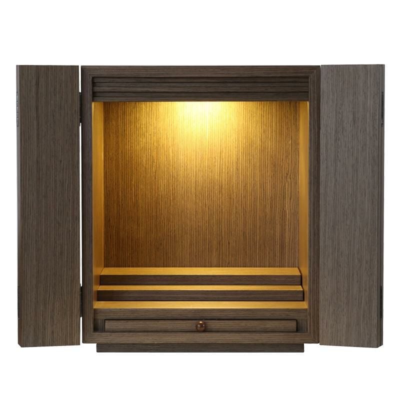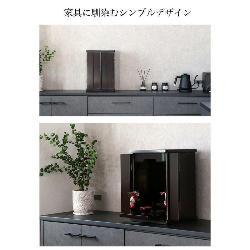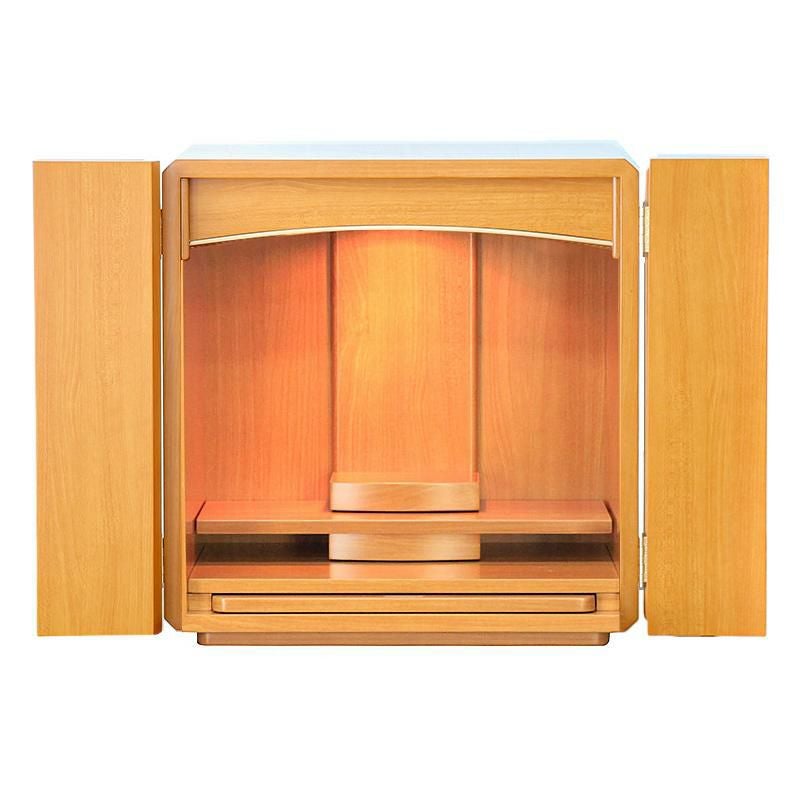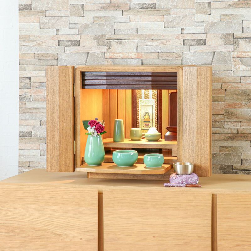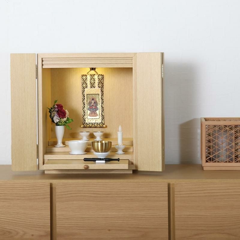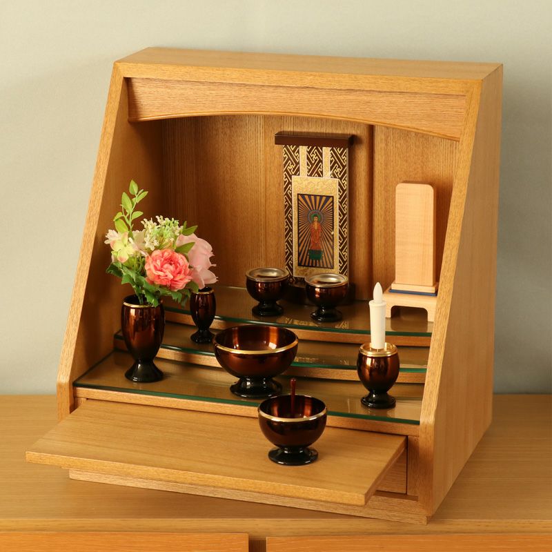 扉のないシンプルなデザインのお仏壇です。大きなお仏壇を置く場所がない方に、リビングの一角でおまいりしたい方に、お仏壇らしくないデザインをお探しの方におすすめです。