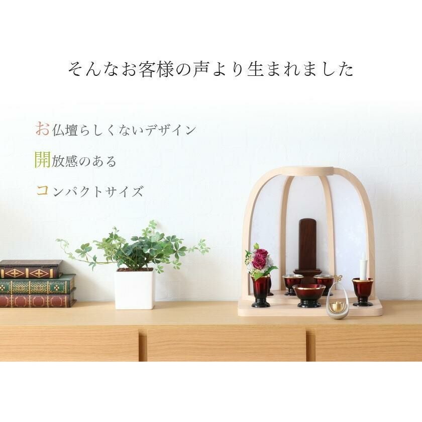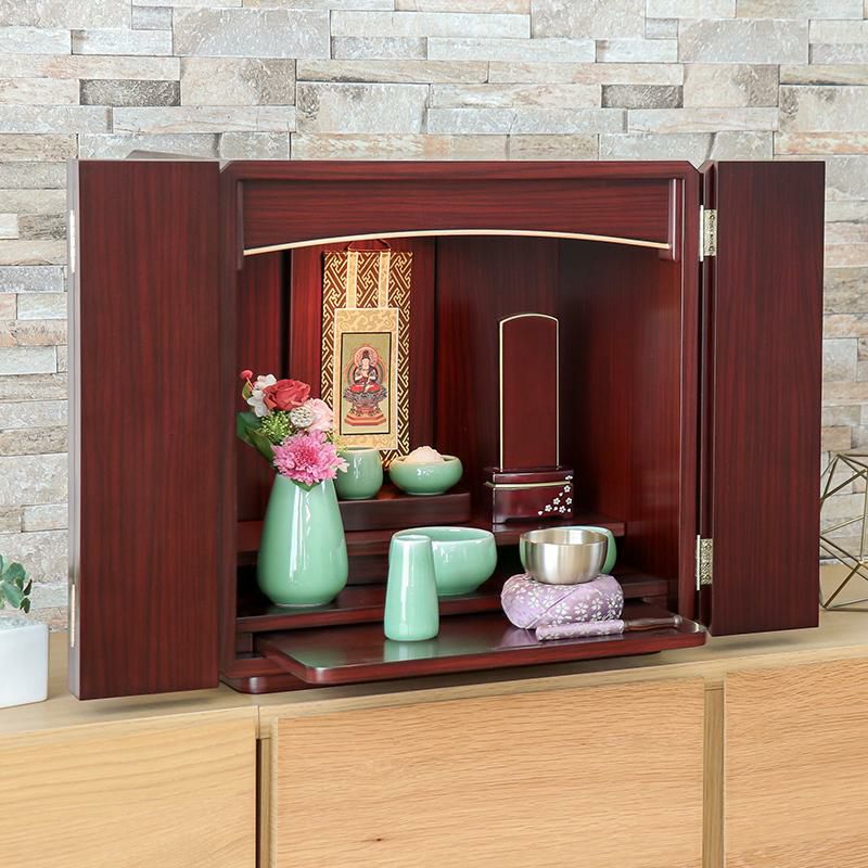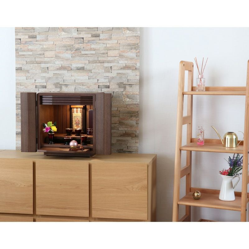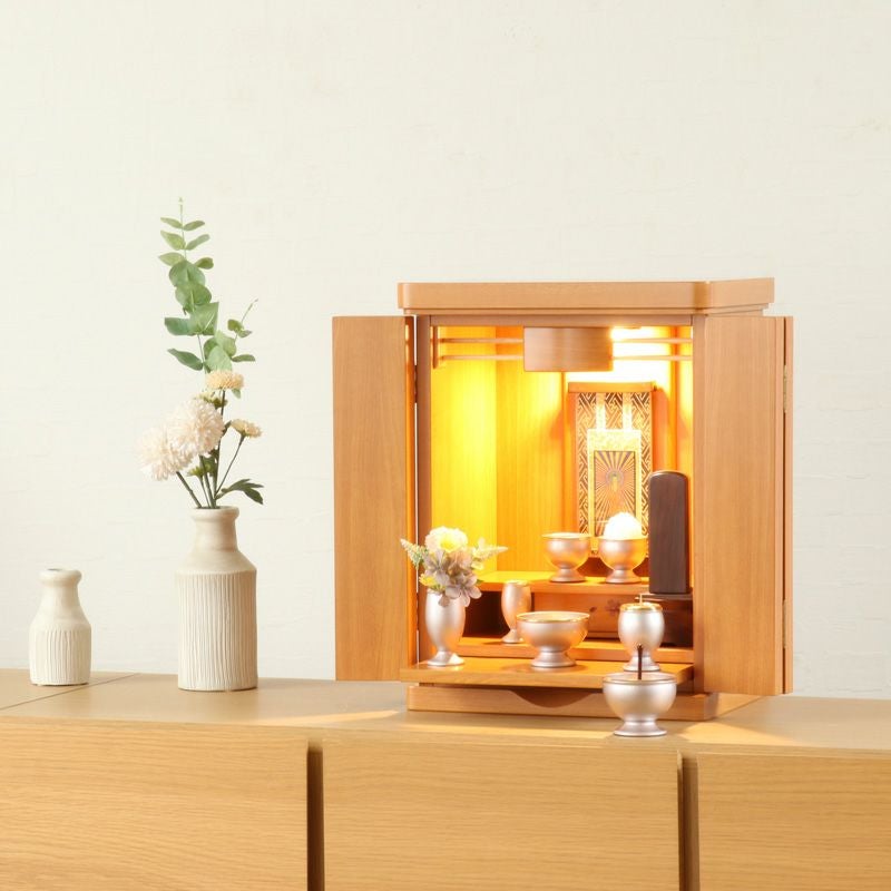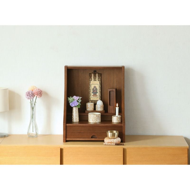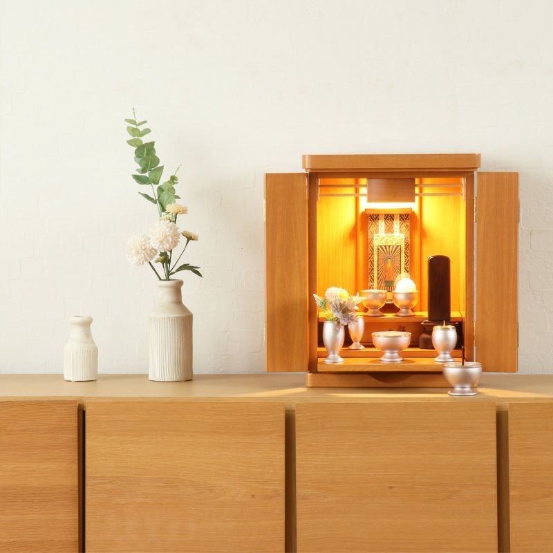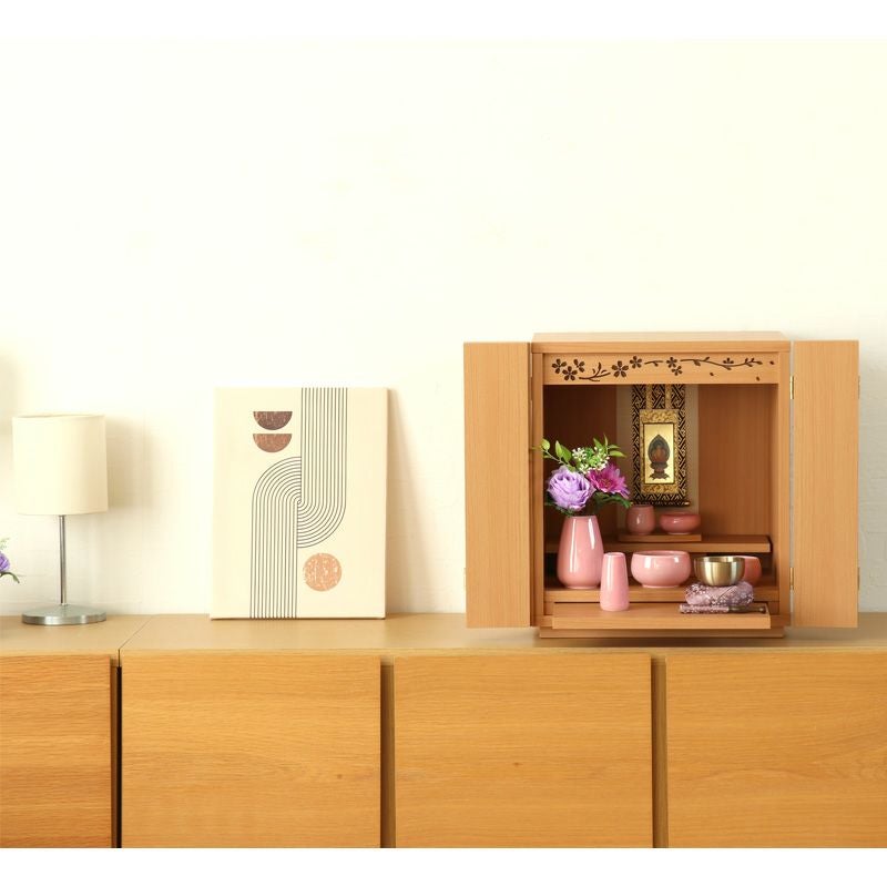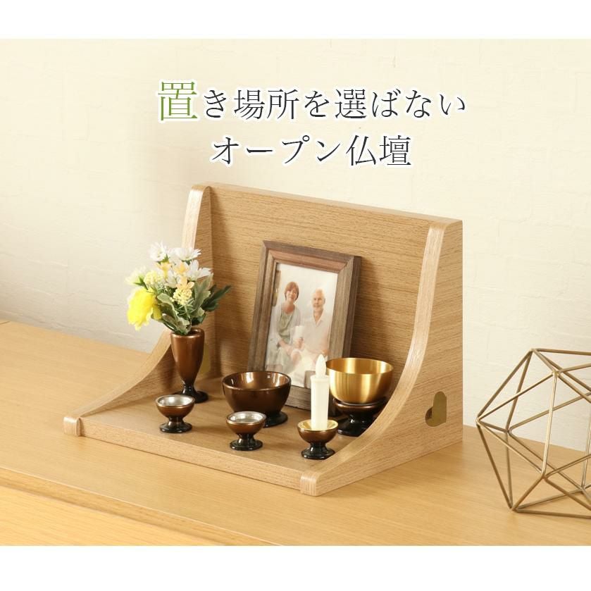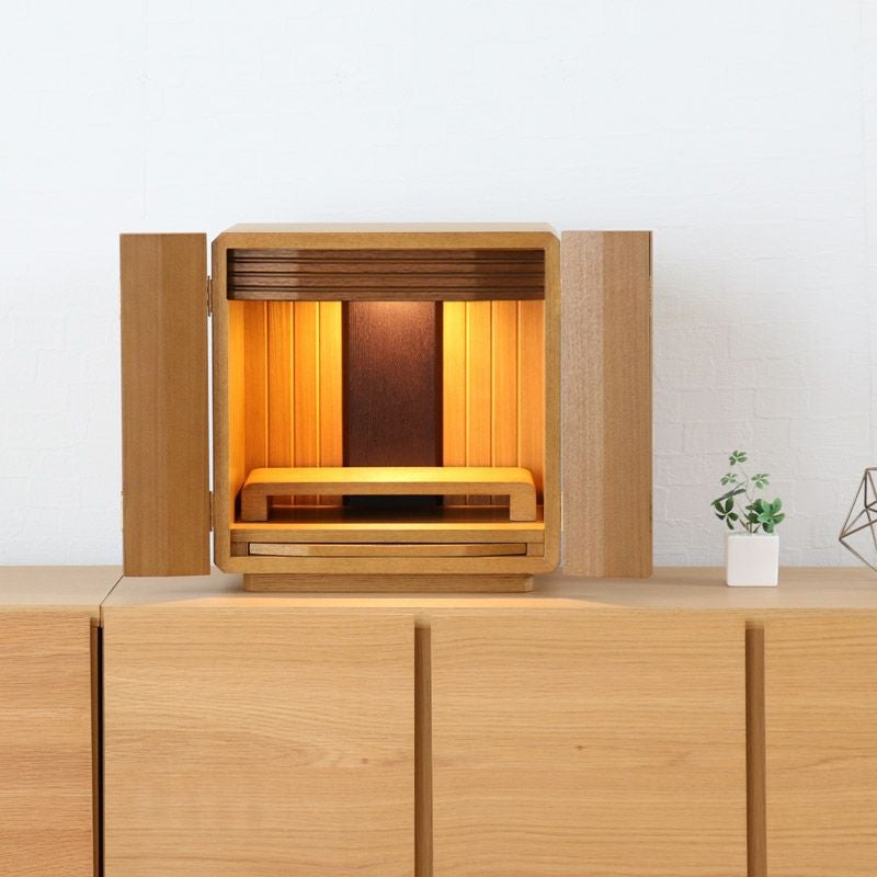 扉のないシンプルなデザインのお仏壇です。大きなお仏壇を置く場所がない方に、リビングの一角でおまいりしたい方に、お仏壇らしくないデザインをお探しの方におすすめです。