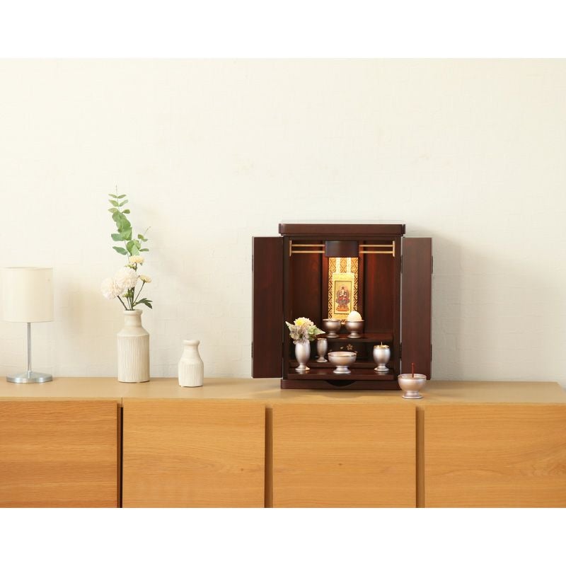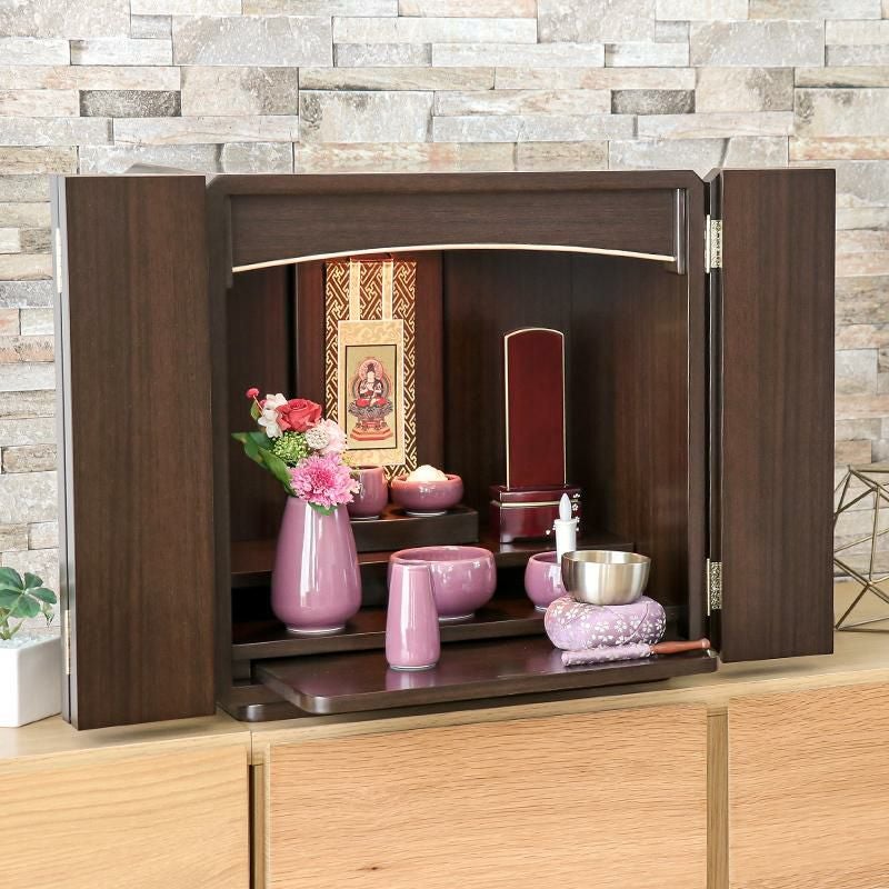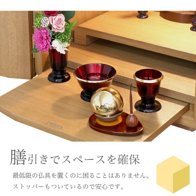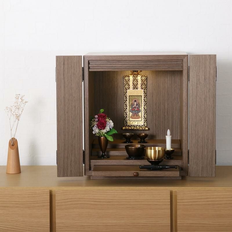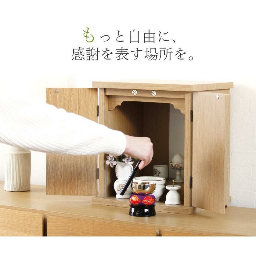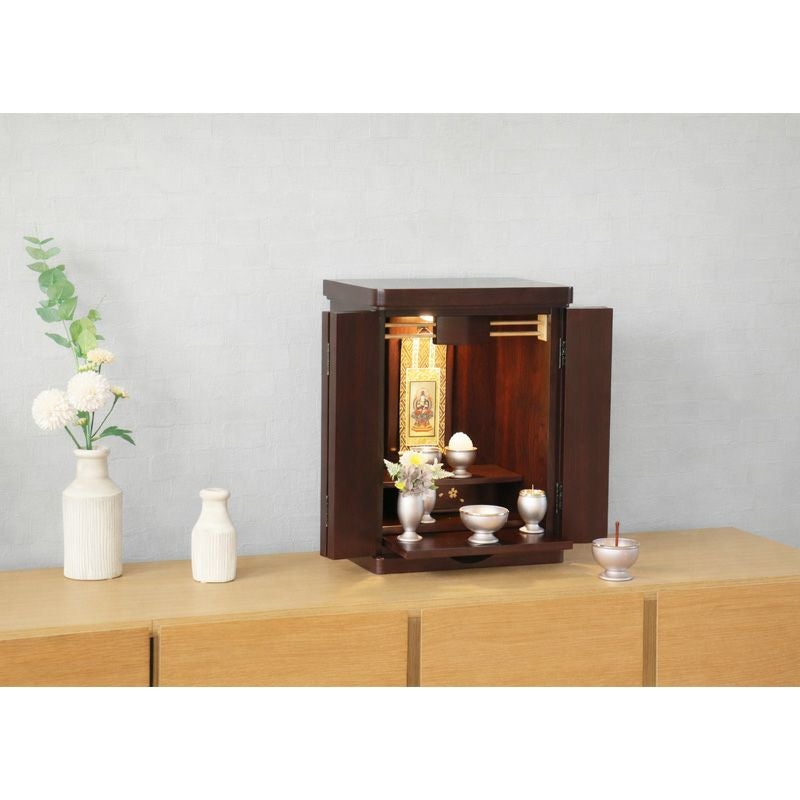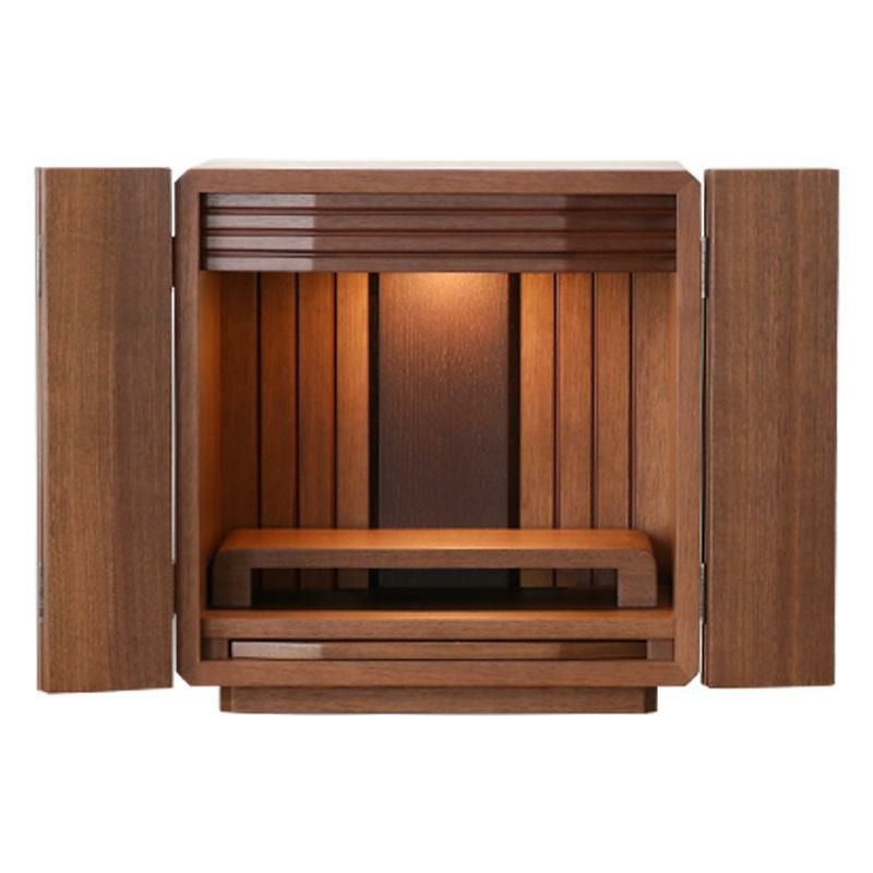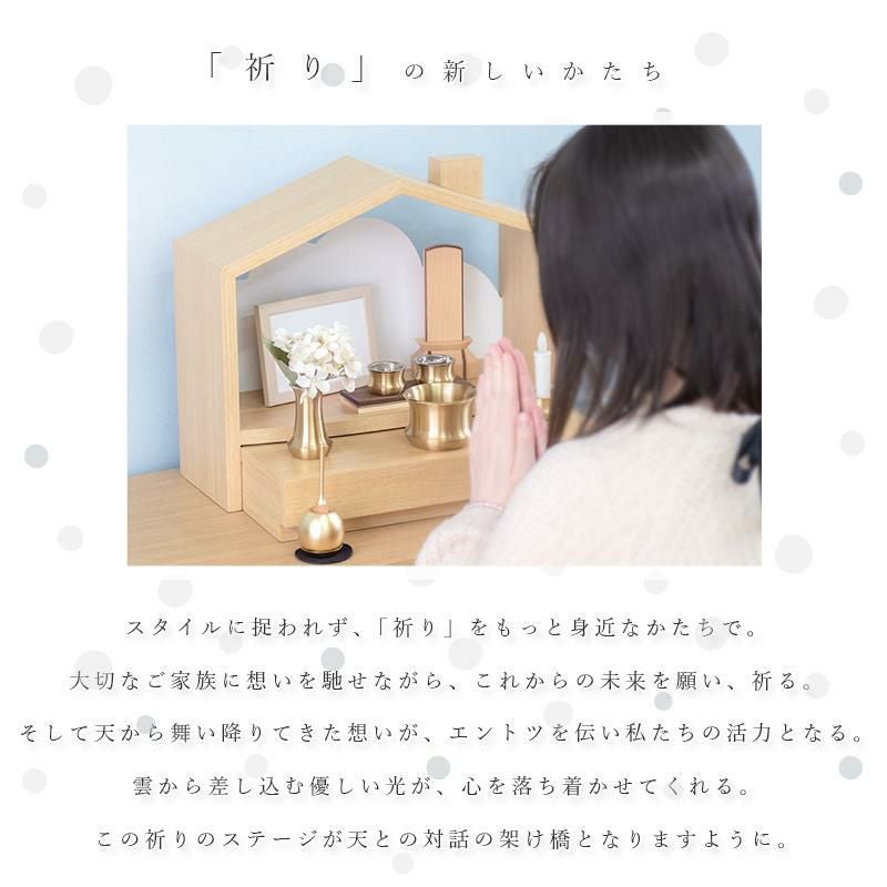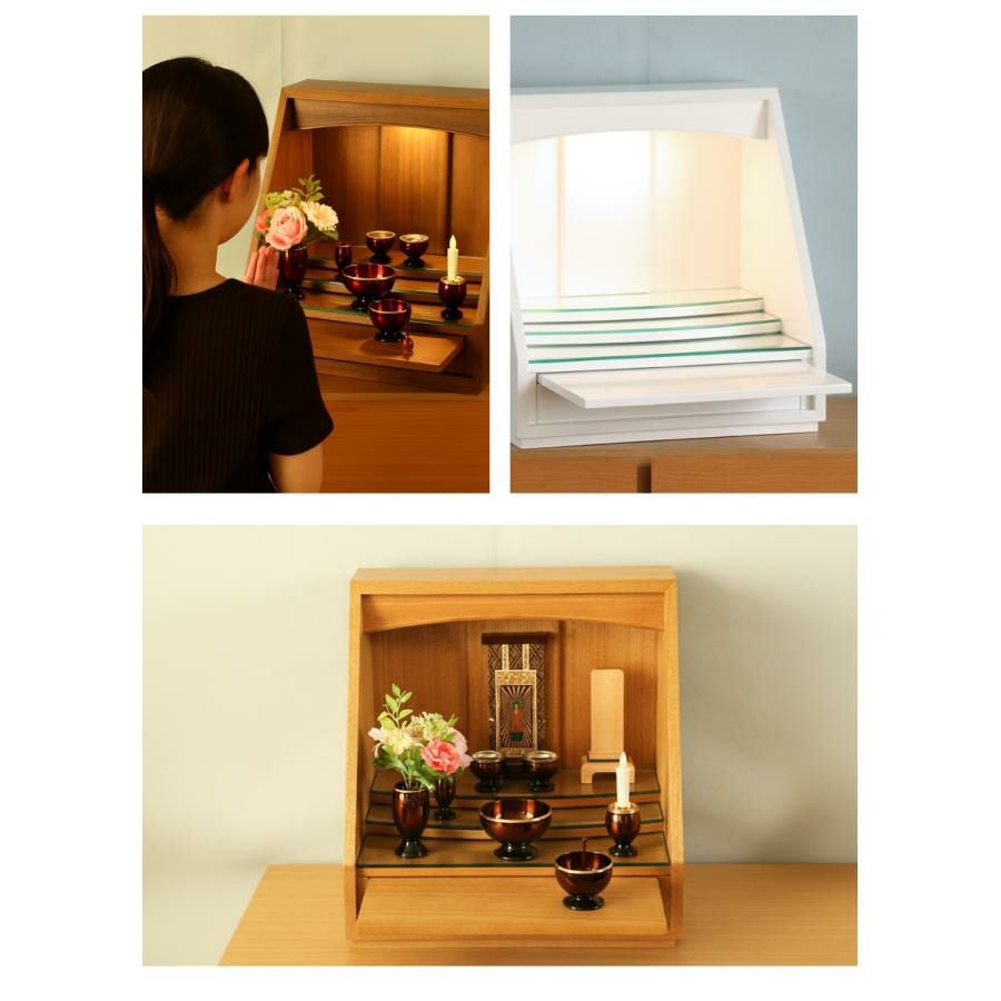 扉のないシンプルなデザインのお仏壇です。大きなお仏壇を置く場所がない方に、リビングの一角でおまいりしたい方に、お仏壇らしくないデザインをお探しの方におすすめです。