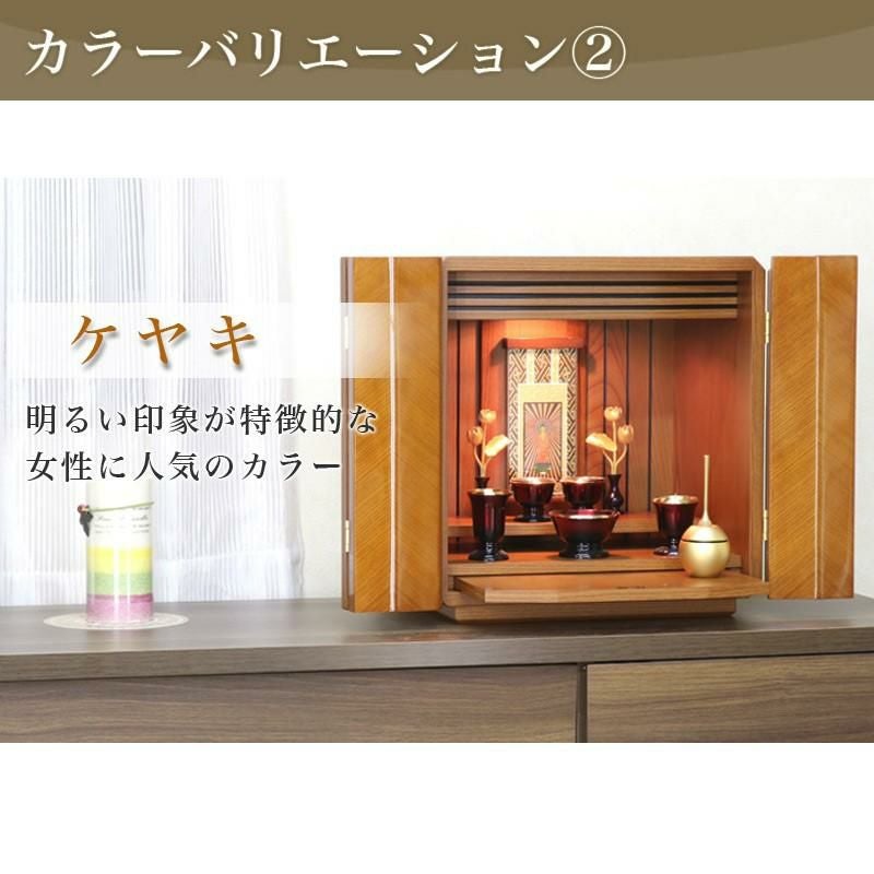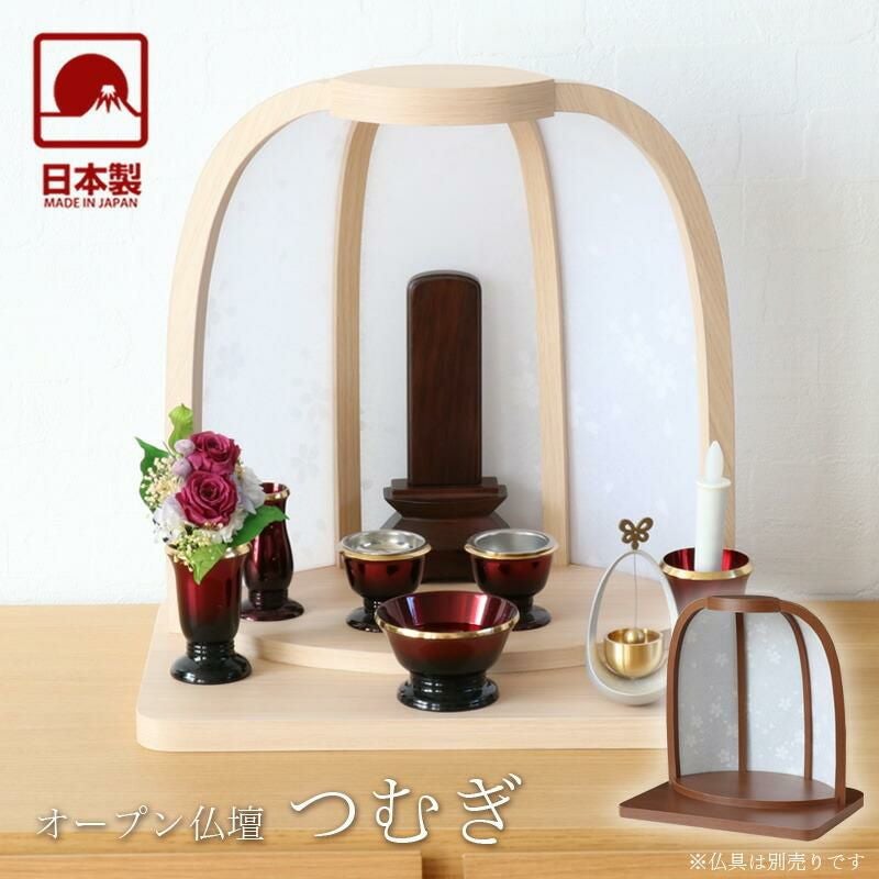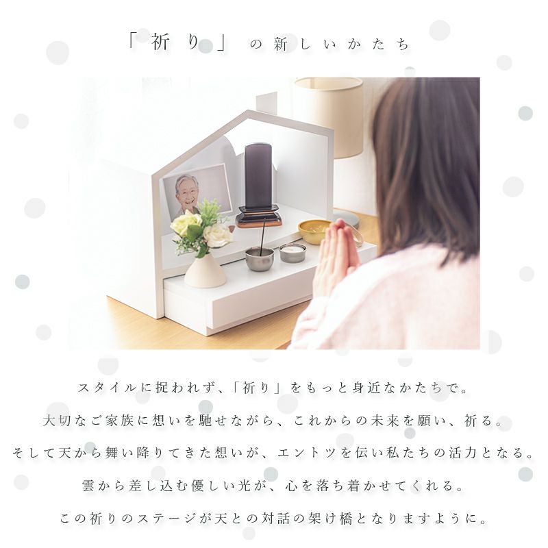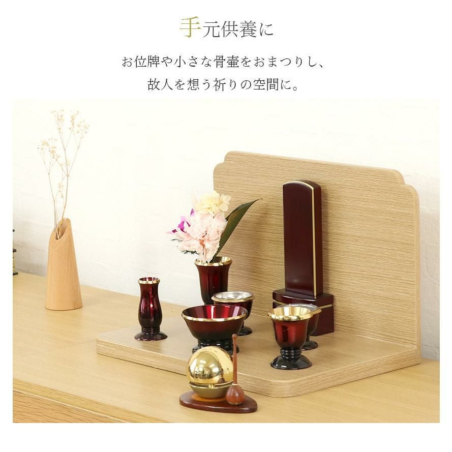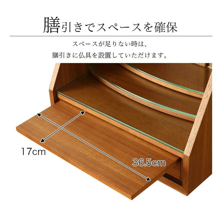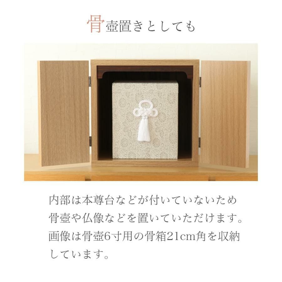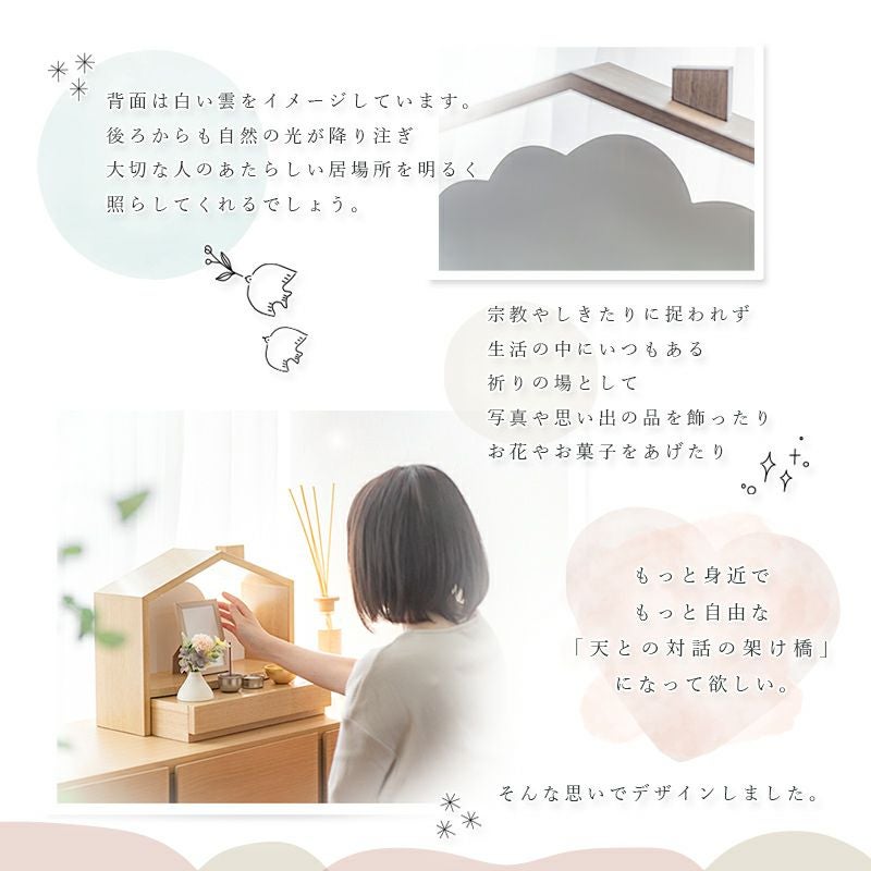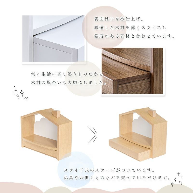 扉のないシンプルなデザインのお仏壇です。大きなお仏壇を置く場所がない方に、リビングの一角でおまいりしたい方に、お仏壇らしくないデザインをお探しの方におすすめです。