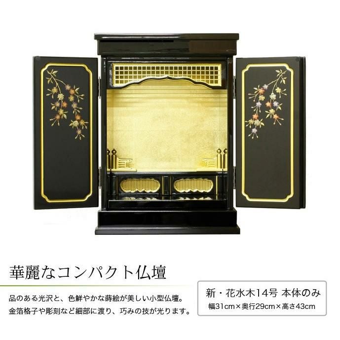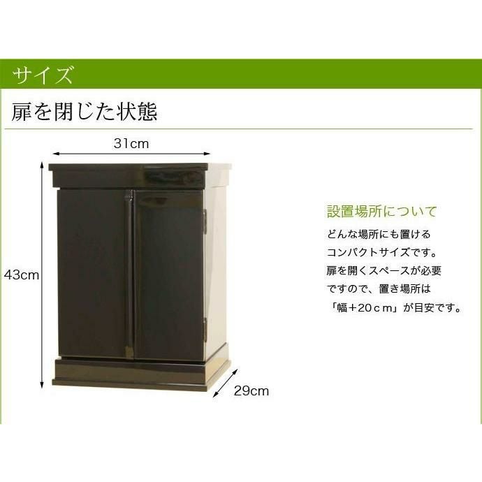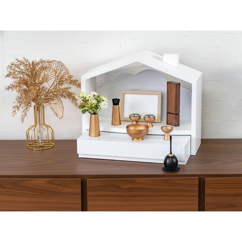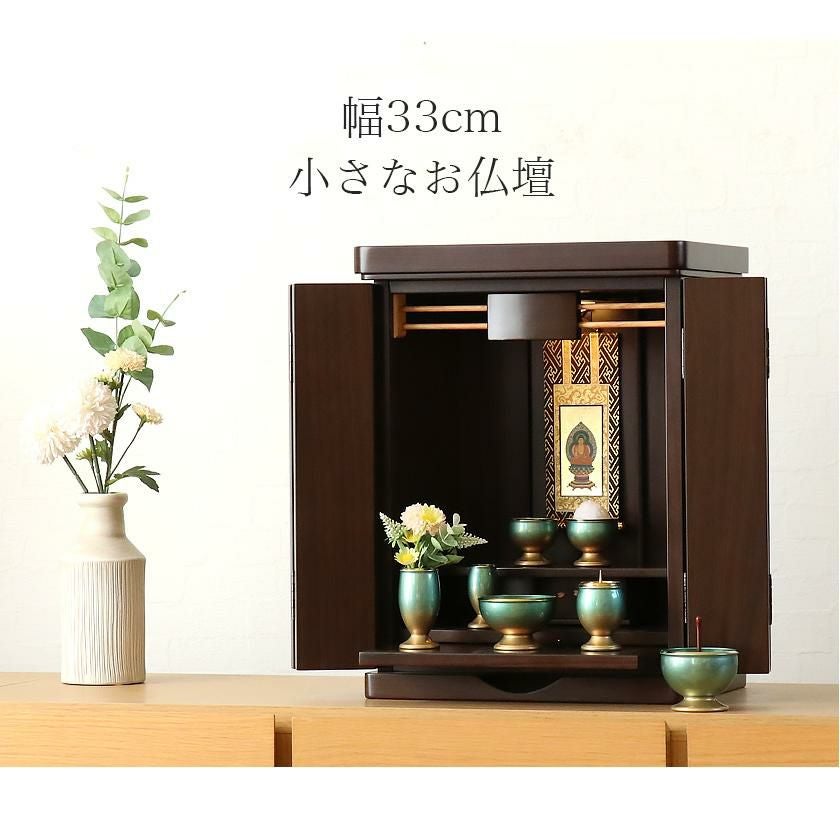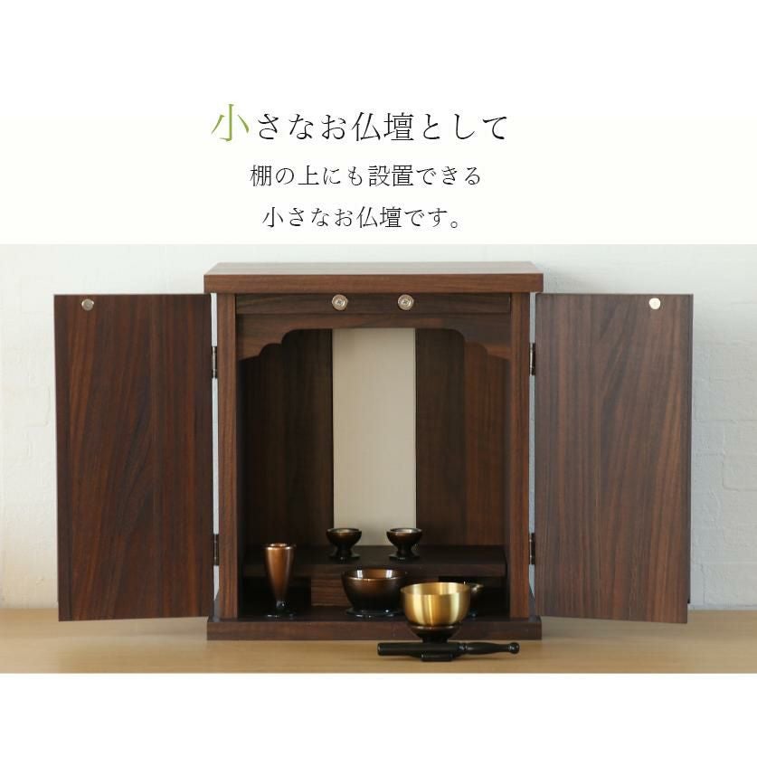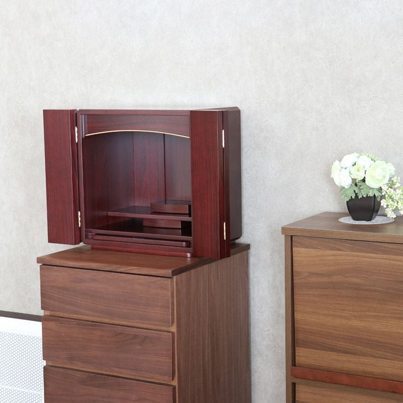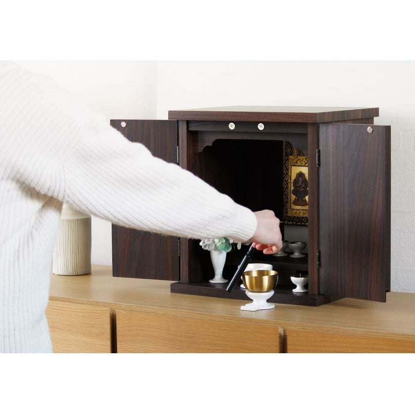 小さなサイズのお仏壇です。コンパクトサイズのため、棚の上などに設置できます。インテリアに調和するモダンなデザインのお仏壇もあります。仏壇専用の下台と組み合わせても設置できます。