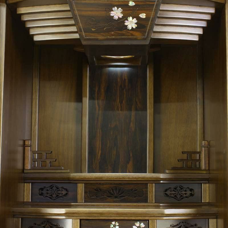 お仏壇内部にLED照明が付いています。 芯材に天然杢の薄板を貼って仕上げています。