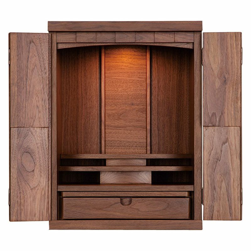 お仏壇内部にLED照明が付いています。棚の取り外しが可能。芯材に天然杢の薄板を貼って仕上げています日本国内で生産しています