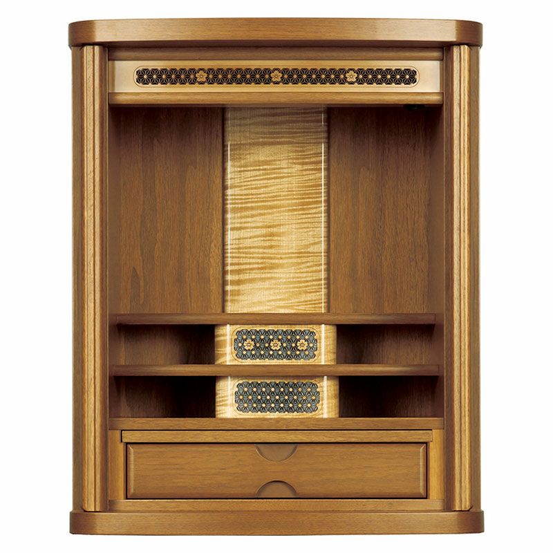 お仏壇内部に100V球が付いています。芯材に天然杢の薄板を貼って仕上げています日本国内で生産しています