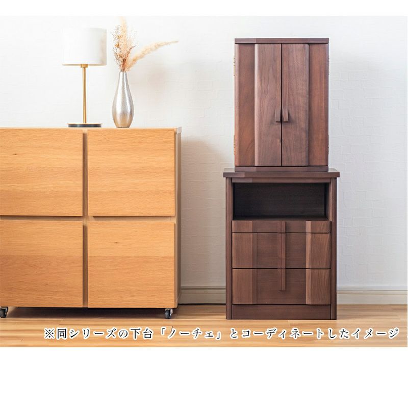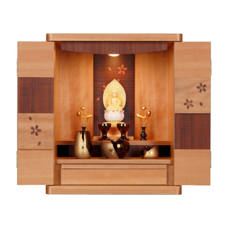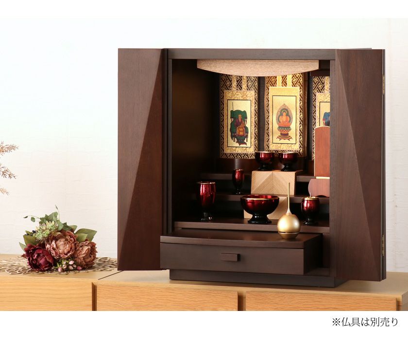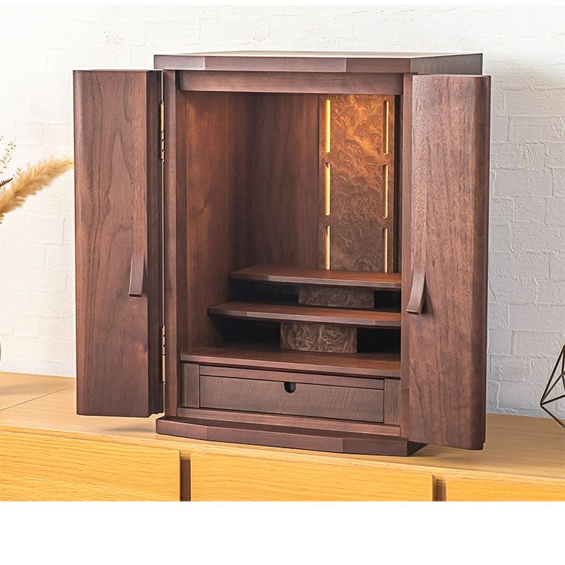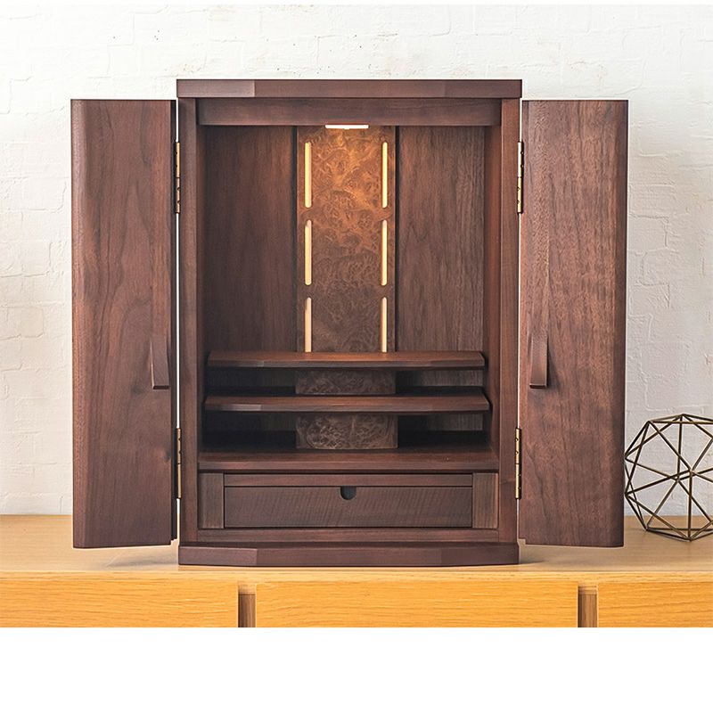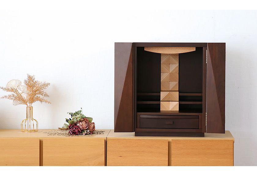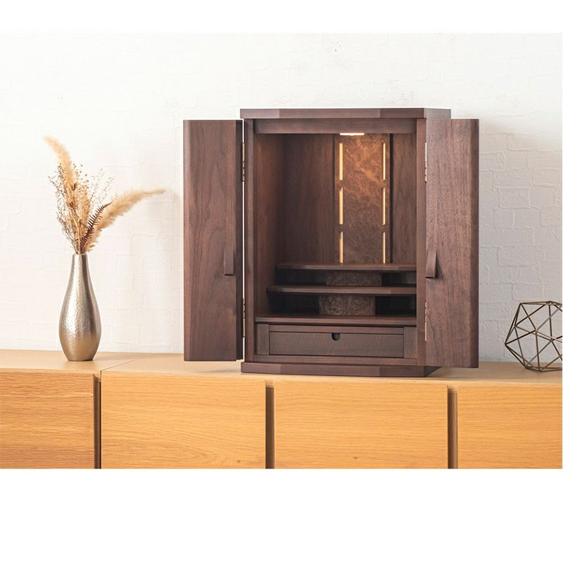 小さなサイズのお仏壇です。コンパクトサイズのため、棚の上などに設置できます。インテリアに調和するモダンなデザインのお仏壇もあります。仏壇専用の下台と組み合わせても設置できます。