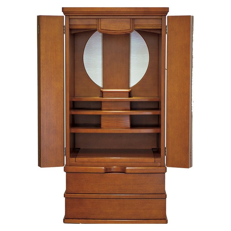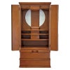 お仏壇内部に100V球が付いています。棚の取り外しが可能。芯材に天然杢の薄板を貼って仕上げています海外で生産し、日本国内で検品しています