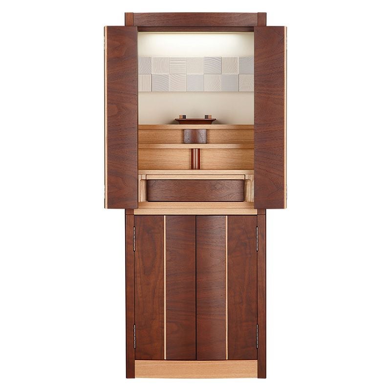 お仏壇内部にLED照明が付いています。芯材に天然杢の薄板を貼って仕上げています海外で生産し、日本国内で検品しています