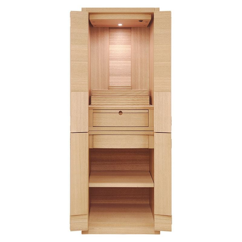 お仏壇内部にLED照明が付いています。芯材に天然杢の薄板を貼って仕上げています海外で生産し、日本国内で検品しています