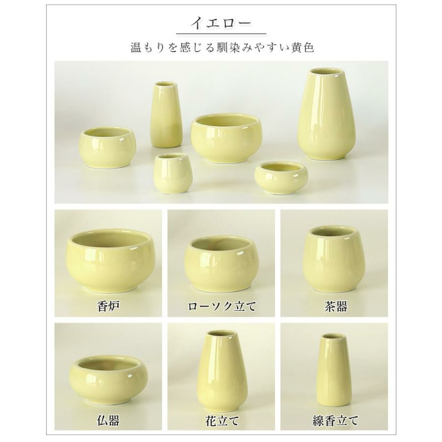 他の画像を見る 選べる2色 美濃焼 5具足 仏具セット 美濃焼仏具 「やわらぎ・中サイズ」 5具足セトモノ モダン仏具 仏壇 花立て 香炉 火立て 燭台 仏器 茶器 仏具付き モダン 仏具セット ピンク 黄色 価格 ¥ 8,240 税込 カートに入れる お気に入りに登録する (0)