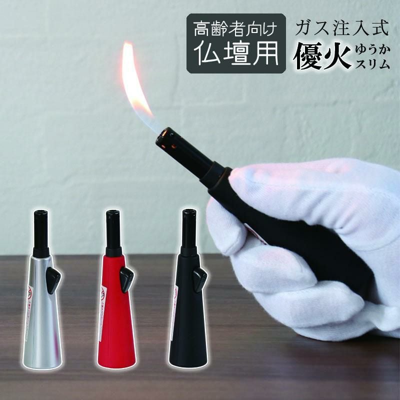 高齢者向け 仏壇用ライター 「優火 スリム」シルバー・レッド・ブラック ガス注入式 ガスマッチ チャッカマン