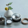 しずく型の本体の中に、「三具足」(火立、香立、花立)がすべておさめられており、台座部分はそのままおりんの役割を担います。