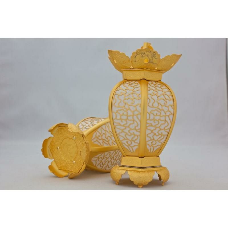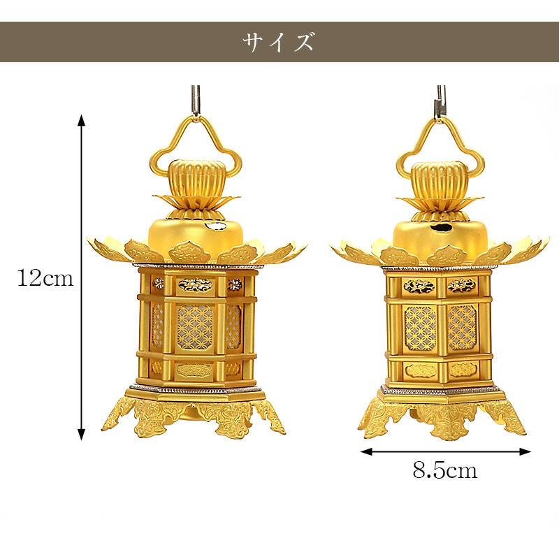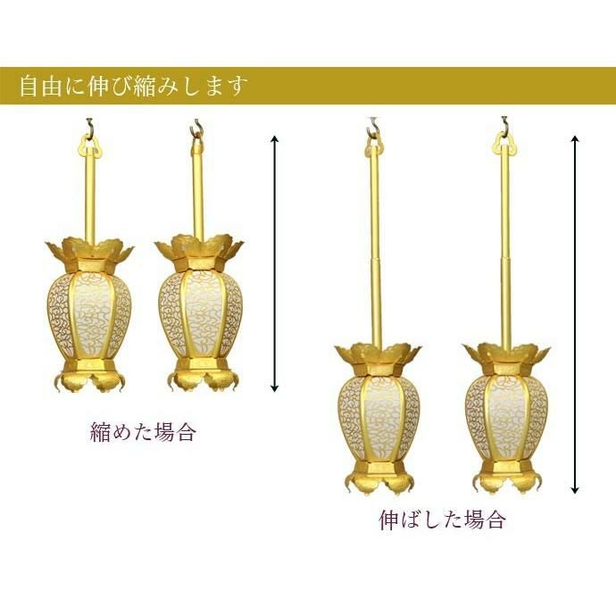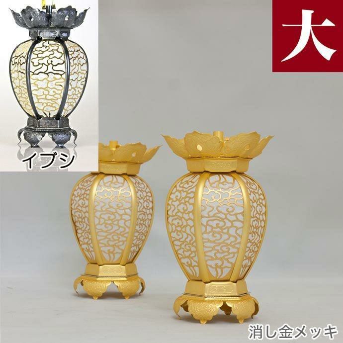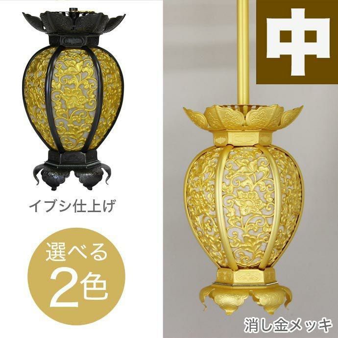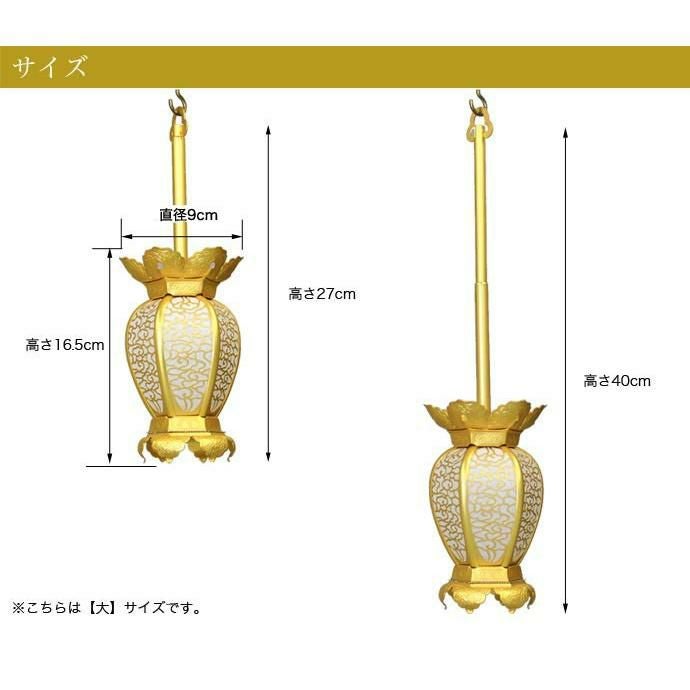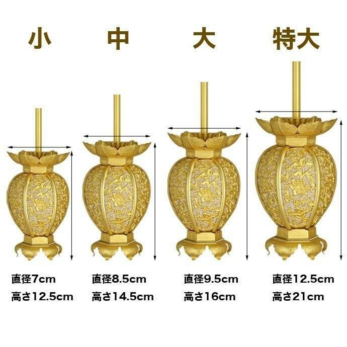 他の画像を見る ご本尊やお仏壇内部を明るく照らします。 吊燈籠(吊り灯篭) アルミ製 京夏目型 唐草入【消し金メッキorイブシ仕上げ】 中 直径9cm 1対 仏具灯篭(とうろう)灯籠 燈籠 価格 ¥ 9,800 税込 詳細を見る お気に入りに登録する (0)