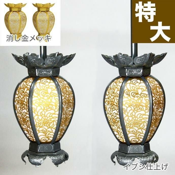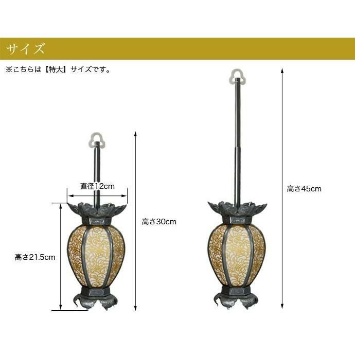 他の画像を見る ご本尊やお仏壇内部を明るく照らします。 吊燈籠(吊り灯篭) アルミ製 京夏目型 唐草入【消し金メッキorイブシ仕上げ】 特大 直径12cm 1対 仏具灯篭 とうろう 燈籠 価格 ¥ 17,100 税込 詳細を見る お気に入りに登録する (0)
