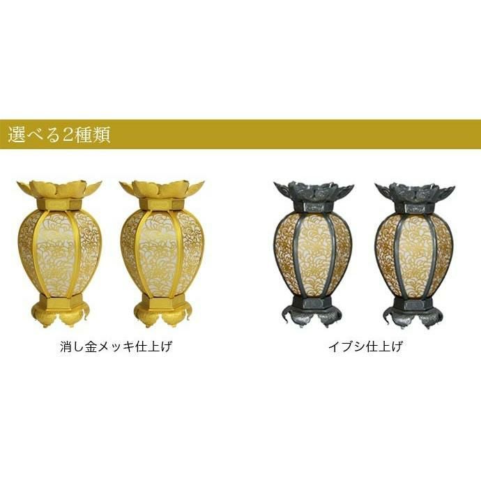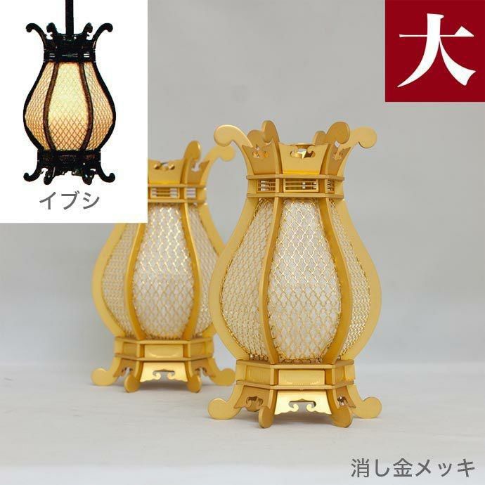 他の画像を見る ご本尊やお仏壇内部を明るく照らします。 吊灯籠(吊り灯篭) 真鍮 利休型(利久形) 大 直径 10cm 1対 [消し金メッキorイブシ] 仏具灯篭 とうろう 燈籠 価格 ¥ 43,300 税込 詳細を見る お気に入りに登録する (0)