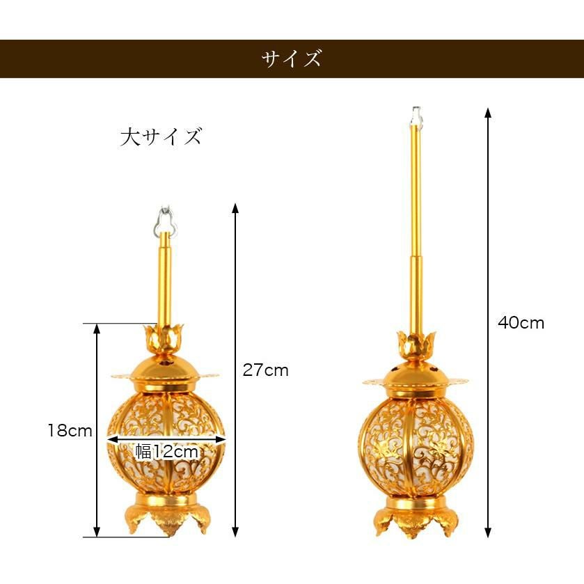 他の画像を見る ご本尊やお仏壇内部を明るく照らします。 吊燈籠(吊り灯篭) アルミ製 京夏目型 唐草入【消し金メッキorイブシ仕上げ】 大 直径10cm 1対 仏具灯篭(とうろう)灯籠 燈籠 価格 ¥ 11,200 税込 詳細を見る お気に入りに登録する (0)