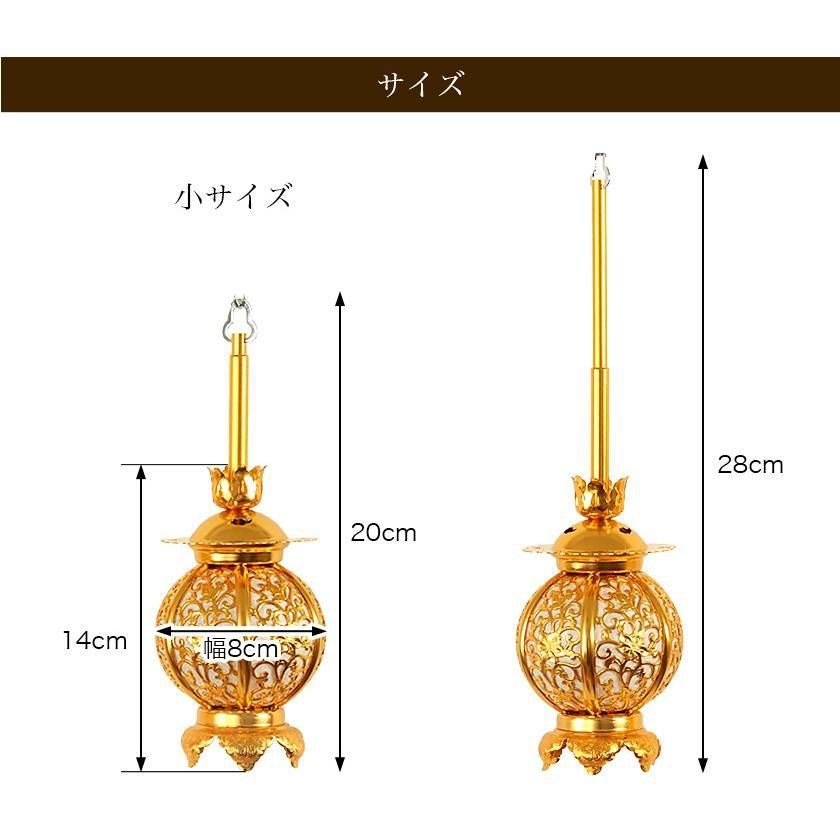 他の画像を見る ご本尊やお仏壇内部を明るく照らします。 吊燈籠(吊り灯篭) アルミ製 京夏目型 唐草入【消し金メッキorイブシ仕上げ】 小 直径8cm 1対 仏具灯篭(とうろう)灯籠 燈籠 価格 ¥ 8,500 税込 詳細を見る お気に入りに登録する (0)