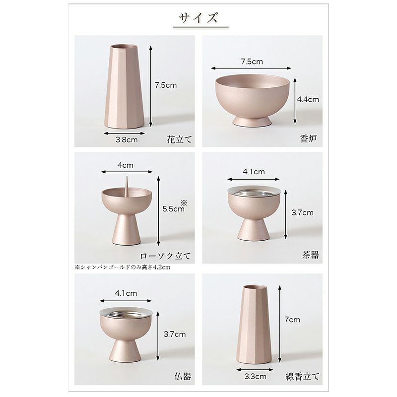 他の画像を見る 選べる4色 艶消しカラーの仏具6点セット モダン仏具【6点】「セレス 3.0寸」6具足 仏具セット 真鍮製 北欧 おしゃれ 香炉 花立 火立 仏器 茶湯器 艶消し 価格 ¥ 24,800 税込 カートに入れる お気に入りに登録する (0)