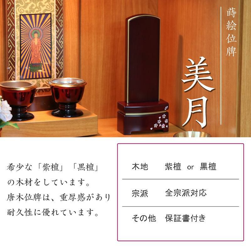 他の画像を見る 唐木位牌「美月」駿河蒔絵 4.5寸 紫檀 黒檀 送料無料 唐木 モダン 位牌 「美月(みづき)蒔絵入り」 4.5寸(高さ18cm)駿河蒔絵 紫檀 黒檀 モダン 桜 さくら 仏壇 文字 優雅 名入れ おしゃれ 価格 ¥ 28,800 税込 詳細を見る お気に入りに登録する