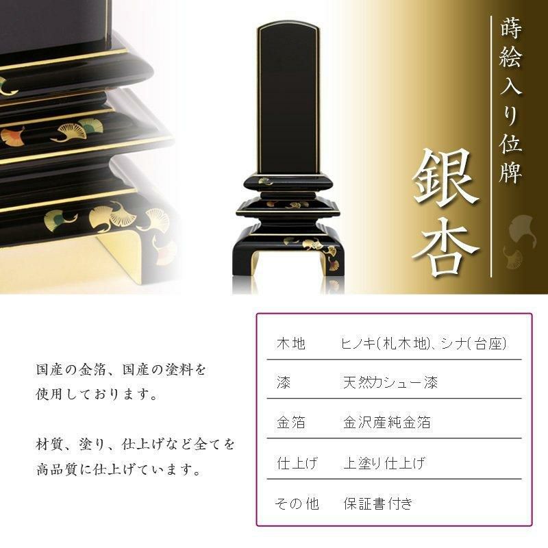 他の画像を見る 蒔絵モダン塗り位牌 いちょう 蒔絵入り 【日本製】 送料無料 位牌 モダン 上塗位牌 「銀杏呂門 銀杏」 4.0寸 花位牌 蒔絵入 4寸 本位牌 モダン 文字 仏具 仏壇 小さい 国産 名入れ おしゃれ 価格 ¥ 101,400 税込 詳細を見る お気に入りに登録する