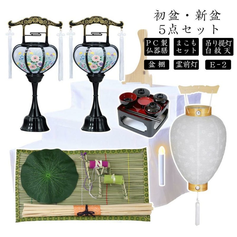 【E-5】(5点セット 白紋天+盆提灯 No.2920+まこもセット+PC仏器膳+盆棚)