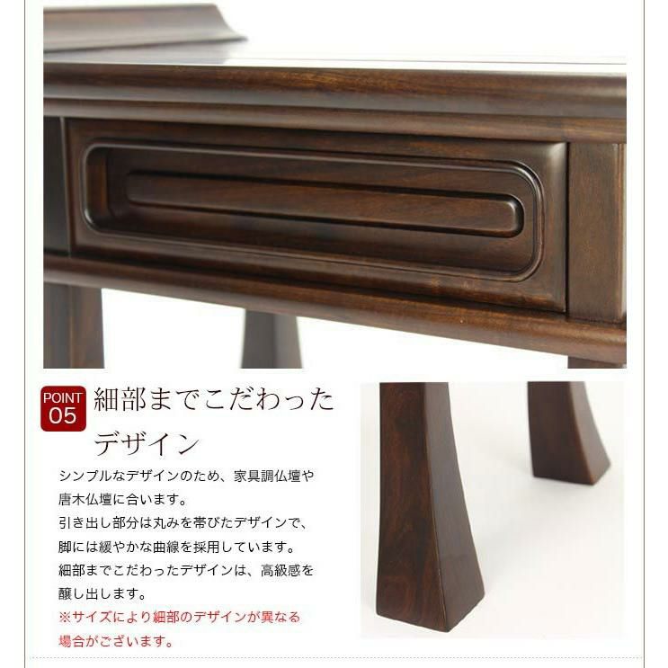 他の画像を見る 唐木仏壇や家具調仏壇におすすめです 高級経机をお探しの方におすすめ! 天然杢を使用した国産品です 経机 紫檀・黒檀 14号 幅42cm「日本製」仏具 仏前 新盆 初盆 お葬式 葬儀 法事 仏壇 テーブル 価格 ¥ 27,800 税込 カートに入れる お気に入りに登録する (0)