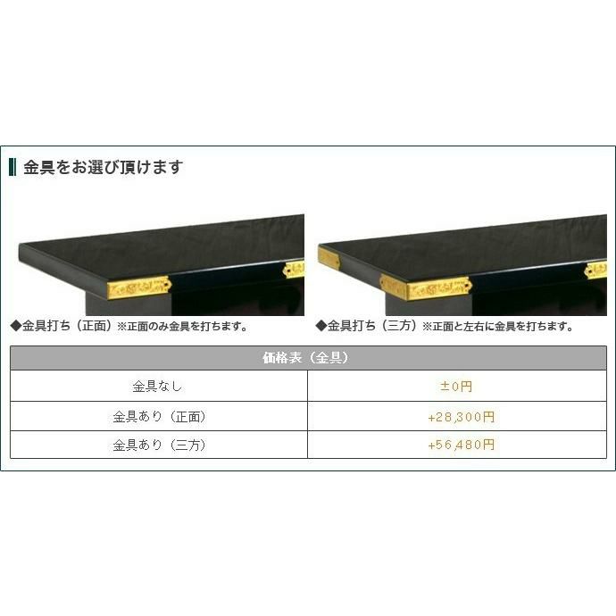 他の画像を見る お仏壇の前に置く金具付き中京型経机 金仏壇におすすめ 浄土真宗用として 経机 上等金箔金具打ち 中京型 18号 御供机 黒塗り 浄土真宗 お東 大谷派 仏壇前机 仏壇 仏具 テーブル 価格 ¥ 63,660 税込 カートに入れる お気に入りに登録する (0)