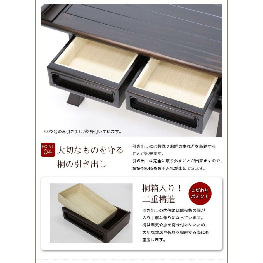 他の画像を見る 唐木仏壇や家具調仏壇におすすめです 高級経机をお探しの方におすすめ! 最高級経机 紫檀・黒檀 総ムク材 22号 幅68cm 無垢材 日蓮宗 正宗 仏壇 仏具 テーブル 価格 ¥ 157,870 税込 カートに入れる お気に入りに登録する (0)
