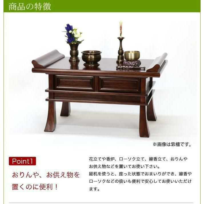 他の画像を見る 唐木仏壇や家具調仏壇におすすめです 高級経机をお探しの方におすすめ! 最高級経机 紫檀・黒檀 総ムク材 22号 幅68cm 無垢材 日蓮宗 正宗 仏壇 仏具 テーブル 価格 ¥ 157,870 税込 カートに入れる お気に入りに登録する (0)