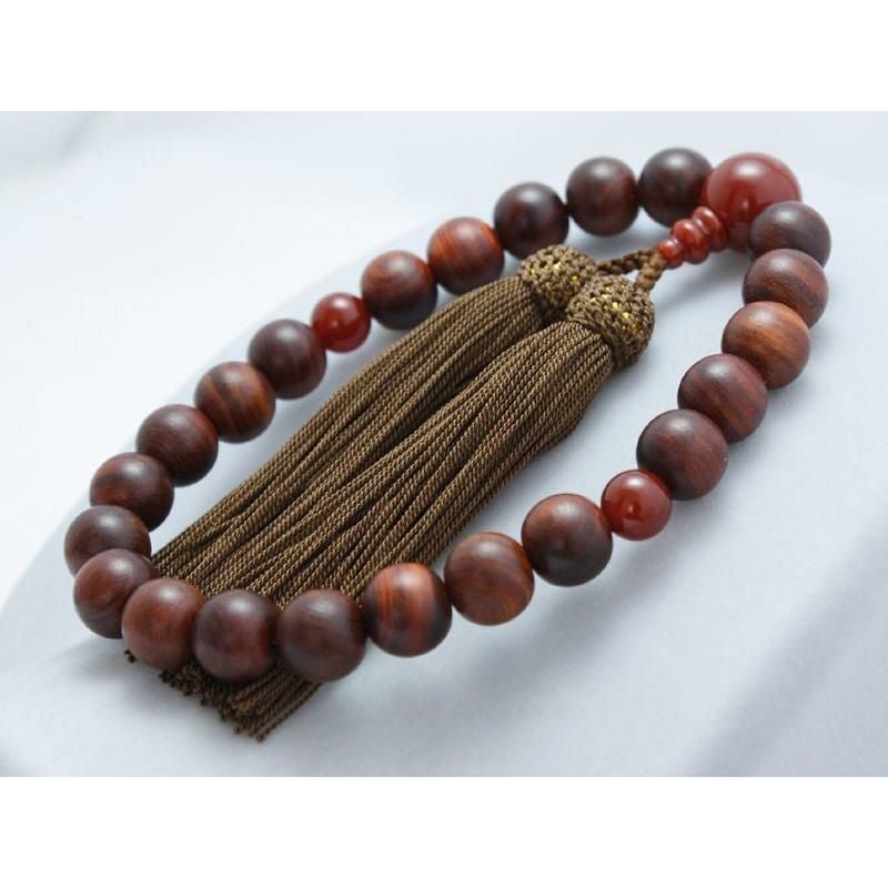 メール便対応 男性用念珠・数珠 片手素挽紫檀×メノウ 貴石仕立 22珠 正絹頭房 こげ茶色(M-015)