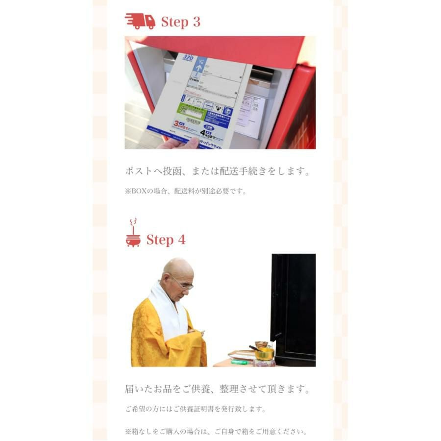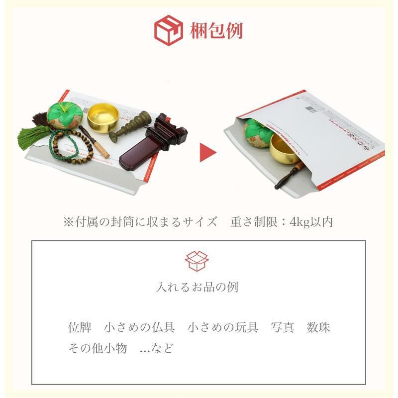 他の画像を見る 大切なお品をまごころ込めて、想い出整理のお手伝いをします。 断捨離【想い出の品を整理しませんか】「想い出レターパック」【プラス】 メール便送料無料 遺品整理 人形供養 位牌 遺影 仏具 お焚き上げ 不要品回収 思い出 価格 ¥ 4,000 税込 カートに入れる お気に入りに登録する (0)