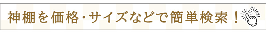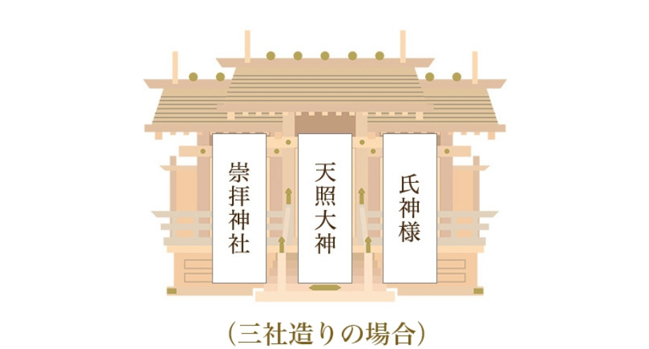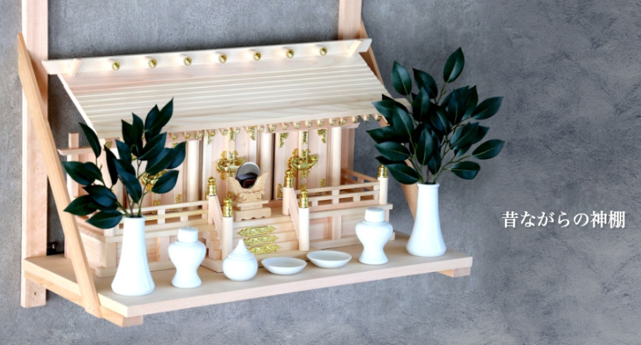 御神札を三枚収めることができる「三社造り」が最も一般的で広く普及しており、神具を棚板に並べてお祀りします。