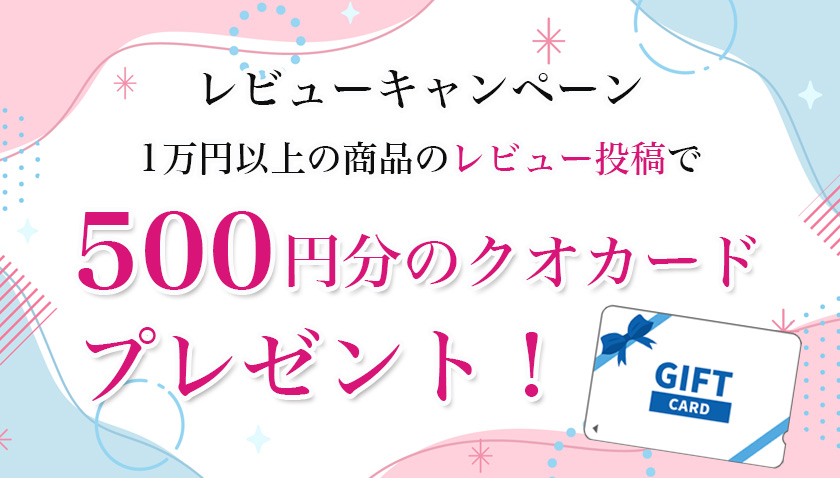 商品到着後、1万円以上の商品レビューを投稿していただくと、レビュー1件につき500円分のクオカードをプレゼントいたします。