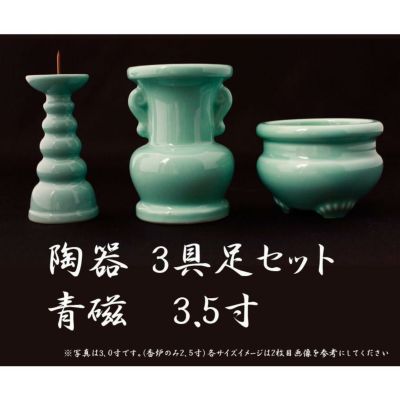 仏具 3点セット 陶器 仏具 「青磁無地」3.5寸 3具足 セトモノ 仏壇 花立て 香炉 ろうそく立て 火立て 燭台 仏具付き 仏具セットのレビューを書く
