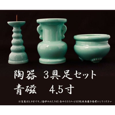 仏具 3点セット 陶器 仏具 「青磁無地」4.5寸 3具足 セトモノ 仏壇 花立て 香炉 ろうそく立て 火立て 燭台 仏具付き 仏具セットのレビューを書く
