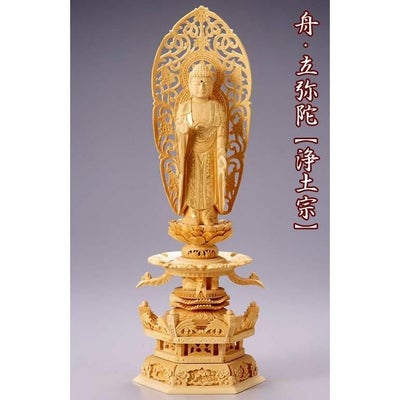 仏像 【白木製】【金泥書き】 六角ケマン台座 5寸(高さ:385mm) 「舟立弥陀」 木彫 浄土宗のレビューを書く