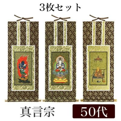 掛け軸 オリジナル掛軸3枚セット 「真言宗」 50代(高さ29cm) 大日如来・不動明王・弘法大師 真言陀羅尼宗 曼荼羅宗 空海 秘密宗 本尊 脇掛のレビューを書く