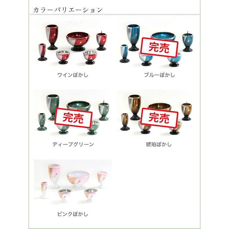 他の画像を見る 陶器仏具+おりんセット 仏具おりんセット 6具足 陶器 「もみじ+お得りん」 選べる5色 花立て 香炉 燭台 火立て 仏器 茶器 おりん付 価格 ¥ 9,980 税込 詳細を見る お気に入りに登録する (0)