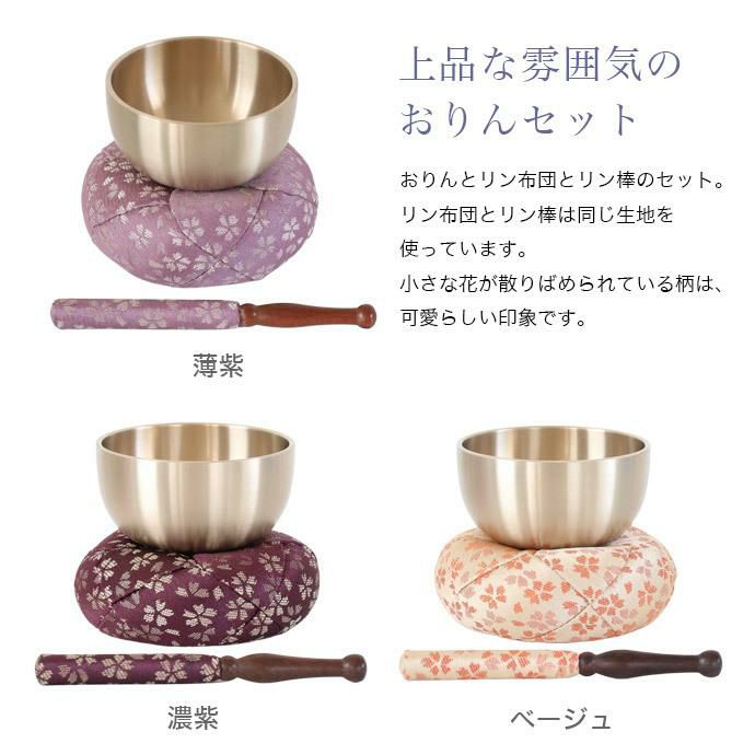 他の画像を見る 可愛らしいデザインのリン布団とリン棒の3点おりんセット 仏具 おりん 国産 おりんセット 4.0寸 【日和(ひより)】 (直径12.2cm)(おリン+リン棒+布団) 仏壇 桜柄 小さい お鈴 花柄 金襴 モダン仏壇用 リン布団 価格 ¥ 11,800 税込 詳細を見る お気に入りに登録する (0)