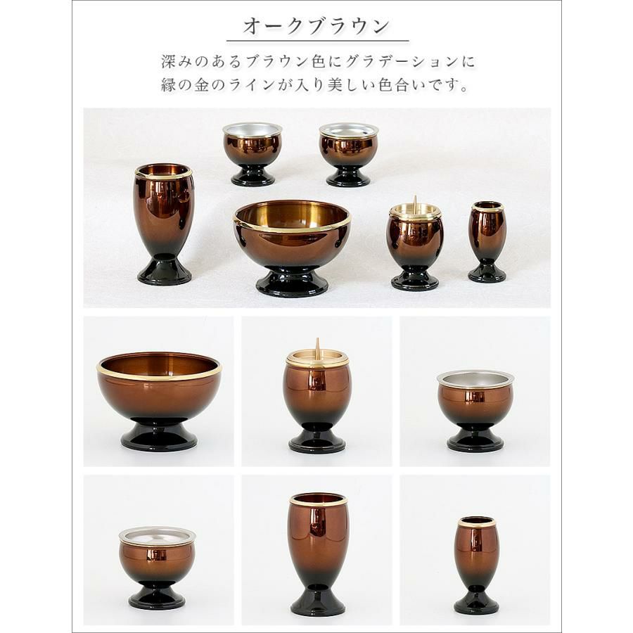 他の画像を見る 選べる5色 光沢感のある仏具6点+おりんセット 仏具6点+おりんセット 真鍮製仏具「流星セット」3寸 六具足 モダン りん棒 香炉 火立て 茶器 仏器 花立て 線香立て 価格 ¥ 23,800 税込 カートに入れる お気に入りに登録する 5.00 (1)