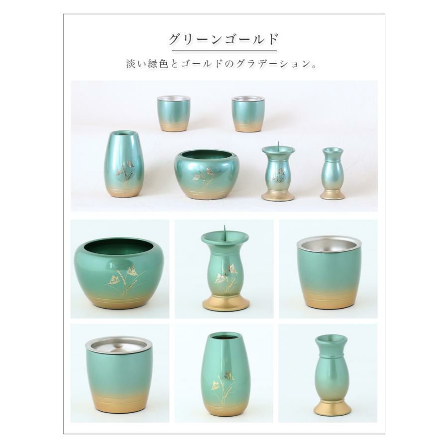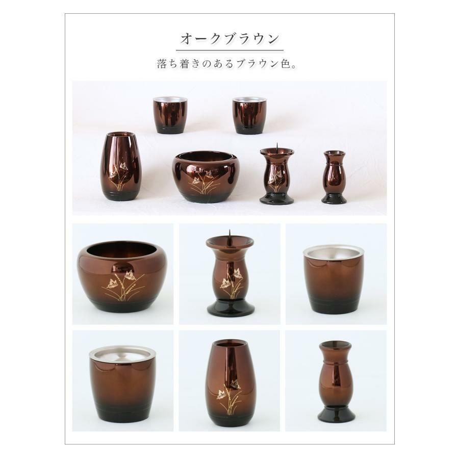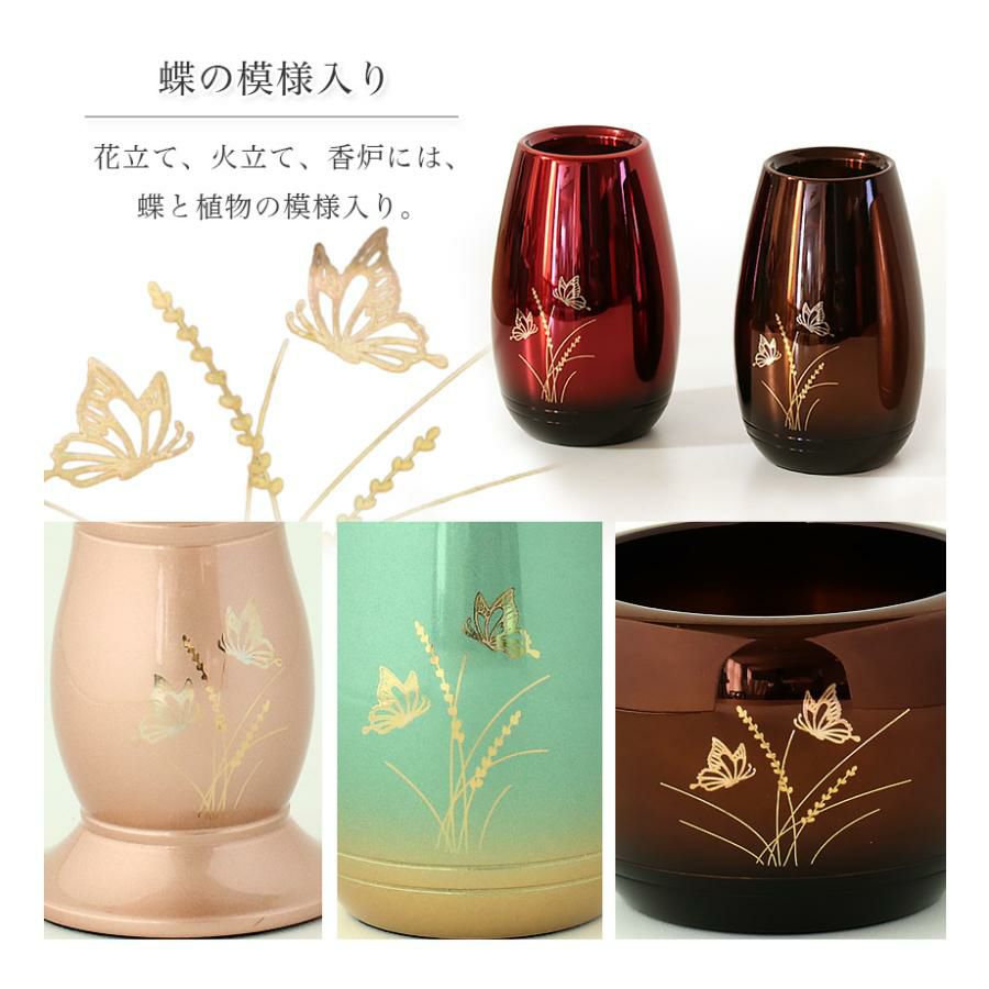 他の画像を見る 選べる4色 蝶の模様付き仏具 仏具セット【6点】「胡蝶(こちょう)」真鍮製仏具 六具足 仏具 モダン 香炉 火立て 茶器 仏器 花立て 線香立て 価格 ¥ 19,800 税込 カートに入れる お気に入りに登録する 5.00 (1)