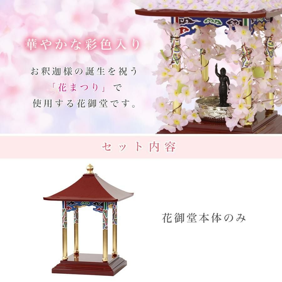 他の画像を見る お釈迦様の誕生を祝う花祭りには 可愛い花飾りの花御堂を! 花御堂 2.0尺 本体 単品 はなみどう はなまつり 花祭り仏具 灌佛盤 灌仏会 お堂 花まつり 木製 彩色 2尺 寺院 お寺 価格 ¥ 238,000 税込 詳細を見る お気に入りに登録する (0)