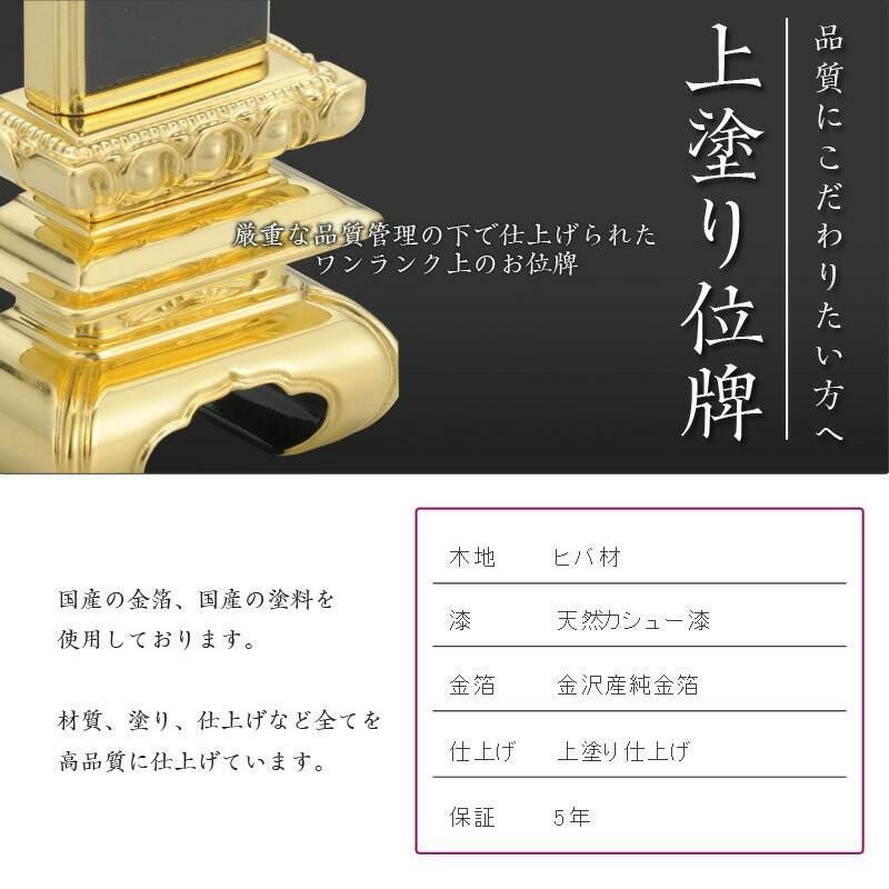 他の画像を見る 位牌 上塗り 49日 四十九日 位牌 上塗 「三方金千倉」 4.0寸(高さ:20.5cm)本位牌 塗位牌 高級 文字 仏具 仏壇 小さい 上塗り 名入れ 価格 ¥ 40,400 税込 詳細を見る お気に入りに登録する (0)