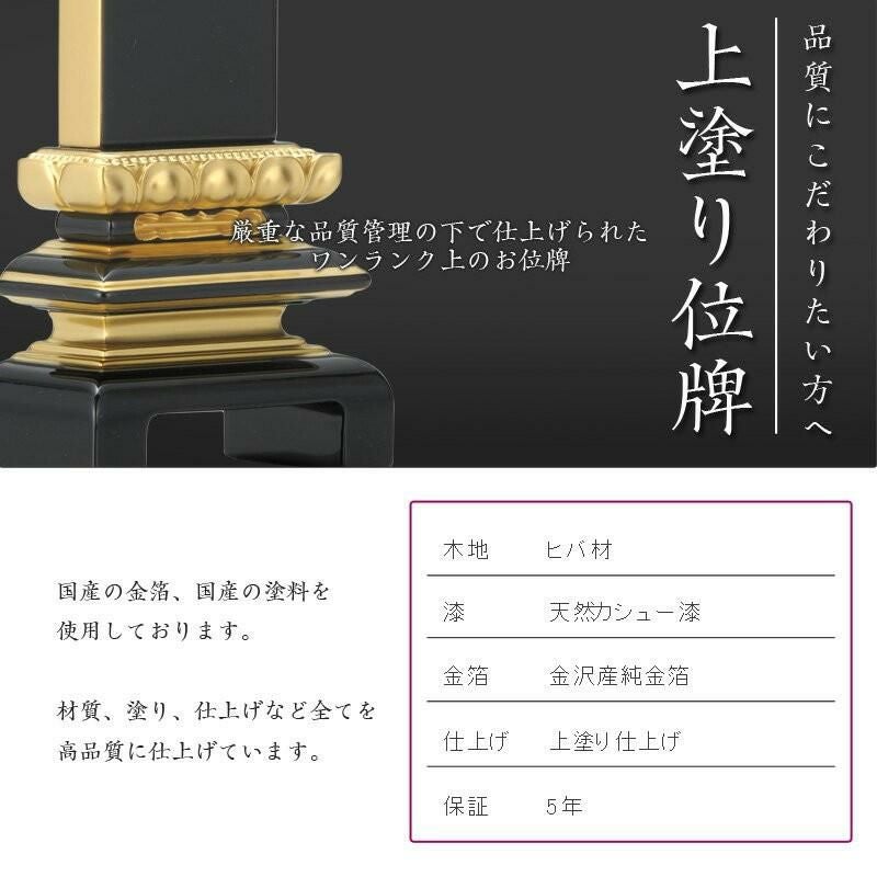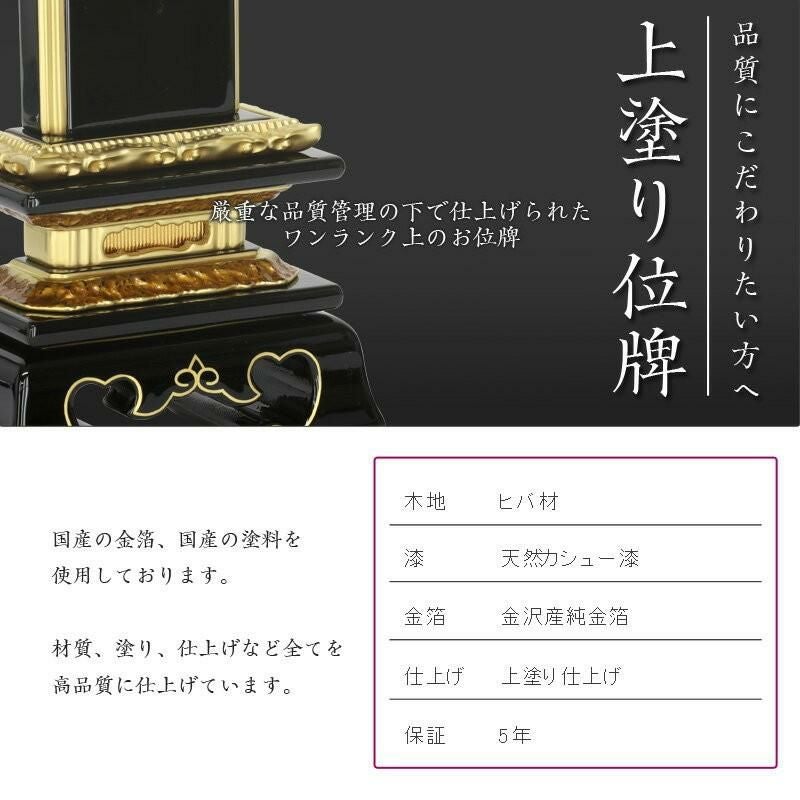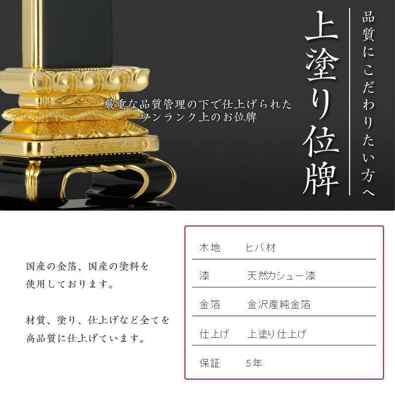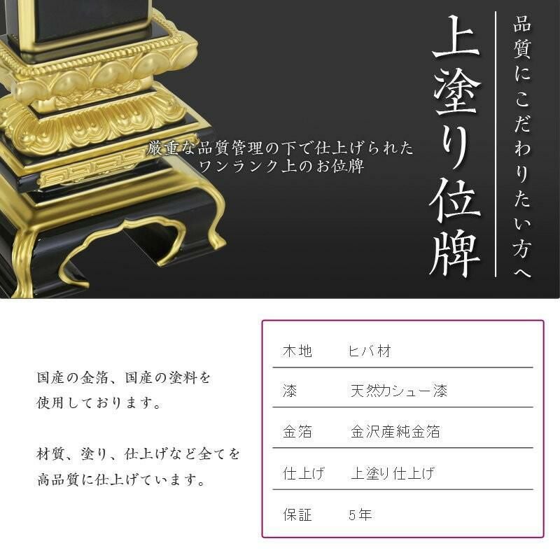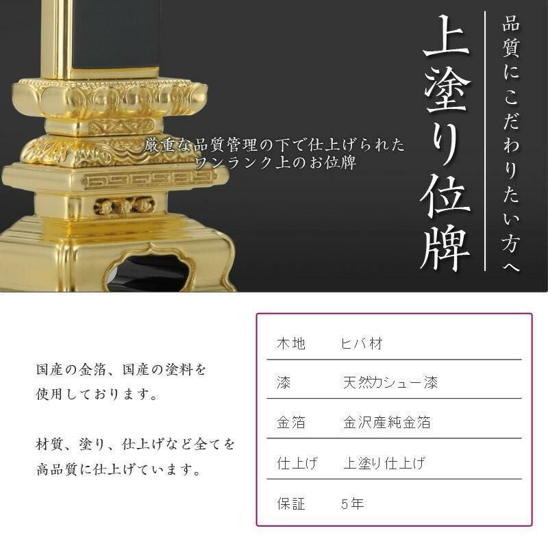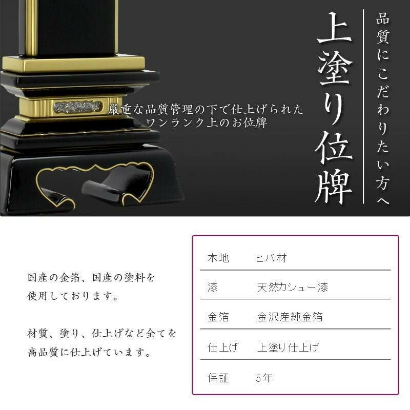 他の画像を見る 位牌 上塗り 49日 四十九日 位牌 上塗 「三方金千倉」 5.5寸(高さ:26.5cm)本位牌 塗位牌 高級 文字 仏具 仏壇 上塗り 名入れ 価格 ¥ 51,200 税込 詳細を見る お気に入りに登録する (0)