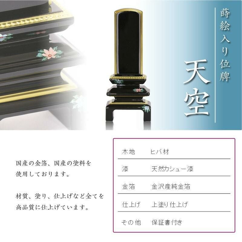他の画像を見る 蒔絵モダン塗り位牌 天空【日本製】 送料無料 位牌 モダン 上塗位牌 「天空」3.0寸・3.5寸・4.0寸・4.5寸・5.0寸 蒔絵入 花位牌 本位牌 文字 仏具 仏壇 名入れ おしゃれ 価格 ¥ 21,390 税込 詳細を見る お気に入りに登録する (0)