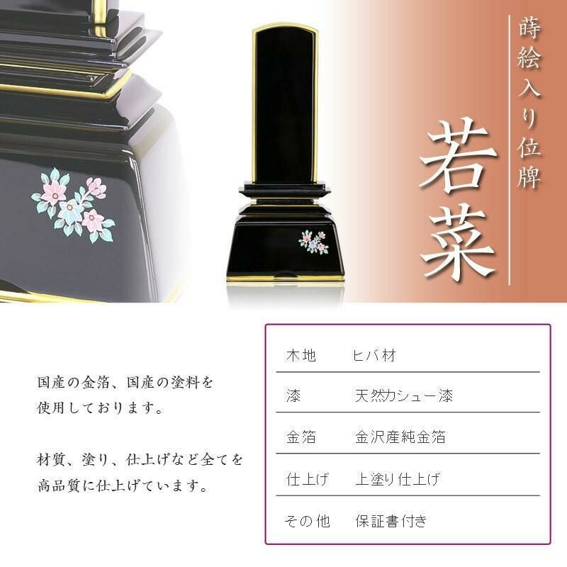 他の画像を見る 蒔絵モダン塗り位牌 若菜 【日本製】 送料無料 位牌 モダン 上塗位牌 「若菜」3.5寸・4.0寸・4.5寸 蒔絵入 花位牌 漆塗り 本位牌 塗り位牌 モダン 文字 仏具 仏壇 小さい 名入れ おしゃれ 価格 ¥ 19,150 税込 詳細を見る お気に入りに登録する (0)