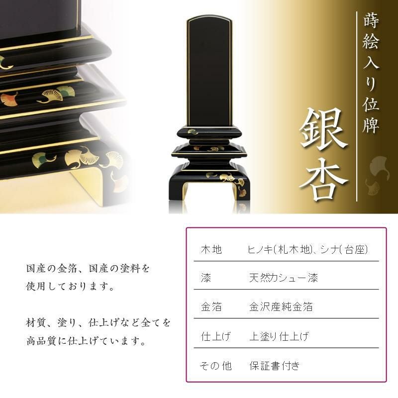 他の画像を見る 蒔絵モダン塗り位牌 いちょう 蒔絵入り 【日本製】 送料無料 位牌 モダン 上塗位牌 「銀杏呂門 銀杏」 4.5寸 花位牌 蒔絵入 本位牌 モダン 文字 仏具 仏壇 小さい 国産 名入れ おしゃれ 価格 ¥ 108,900 税込 詳細を見る お気に入りに登録する (0)