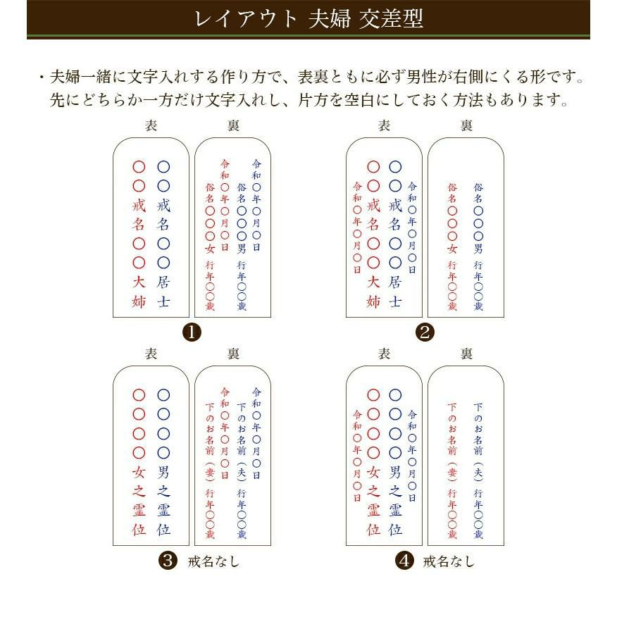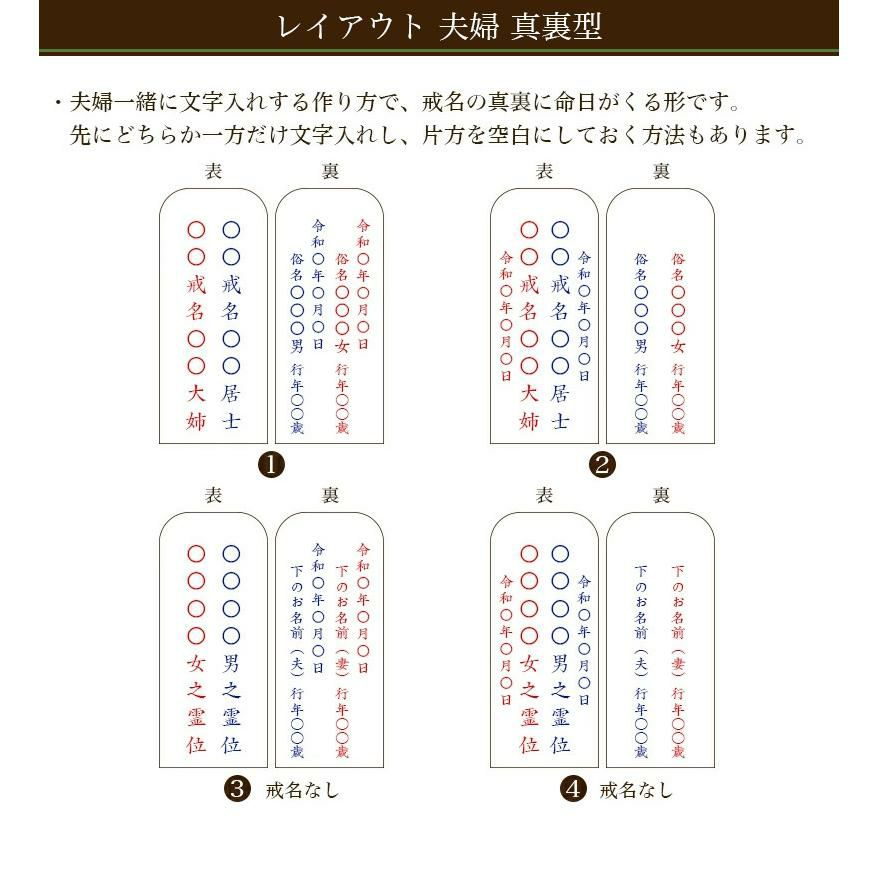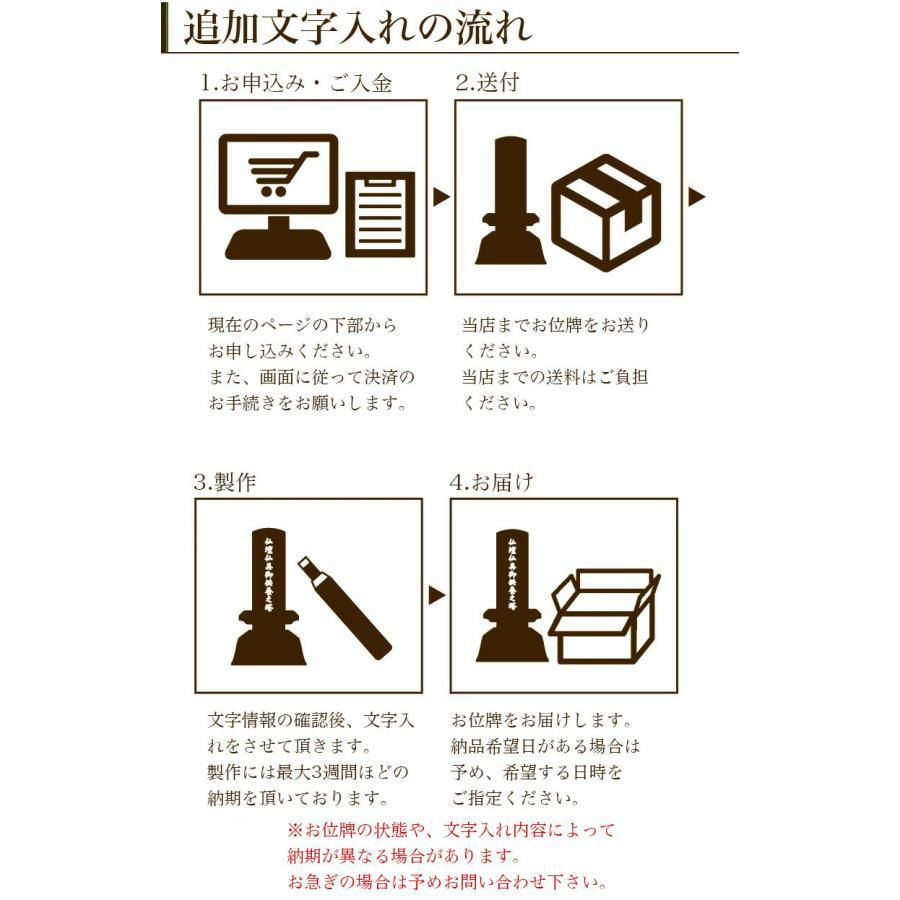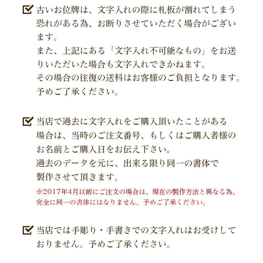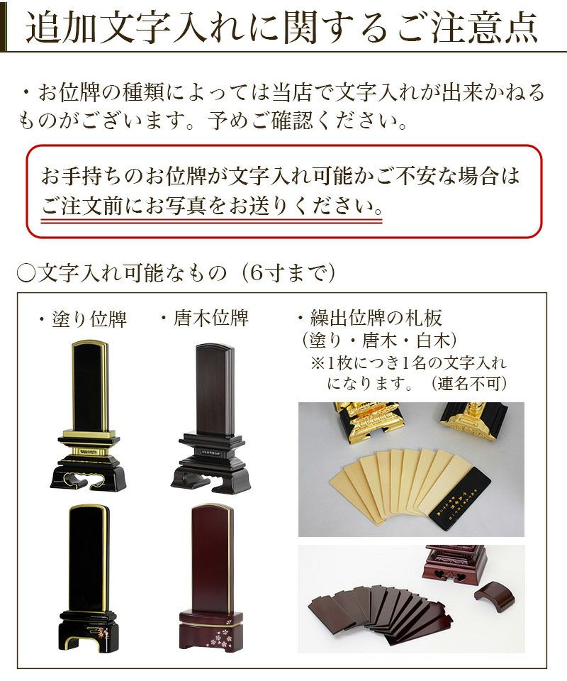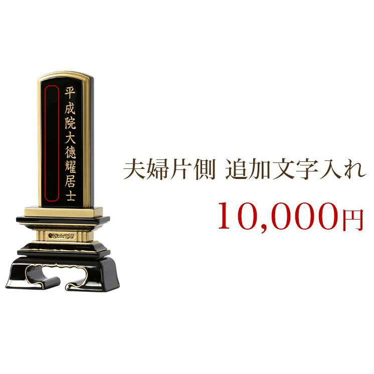 他の画像を見る お持ちのお位牌に追加文字入れをご希望の方で既に片側の方の文字が入っている場合 【夫婦連名への片側追加】お位牌 追加文字入れ 価格 ¥ 10,000 税込 詳細を見る お気に入りに登録する (0)